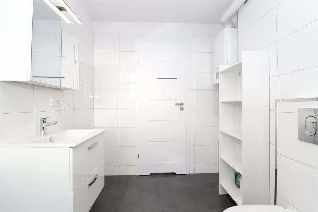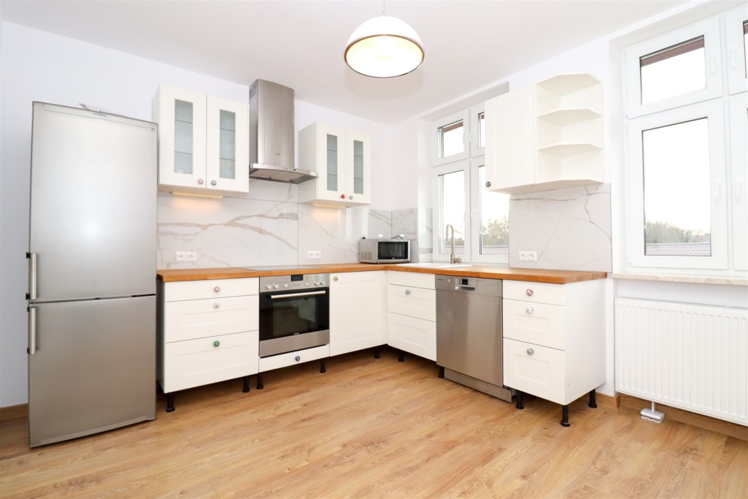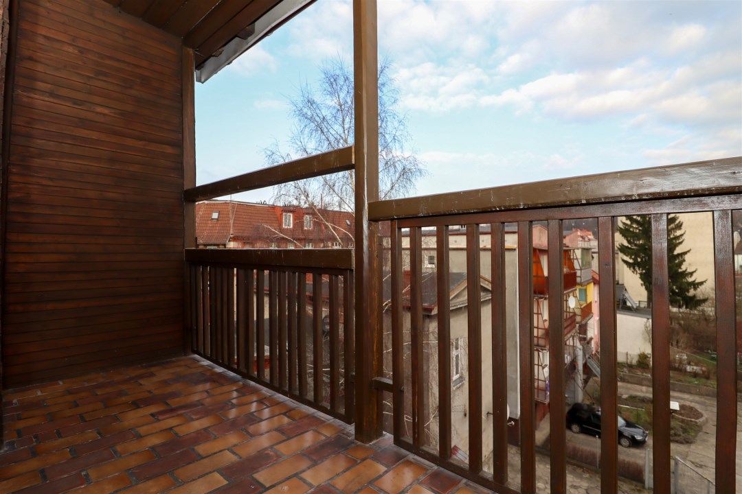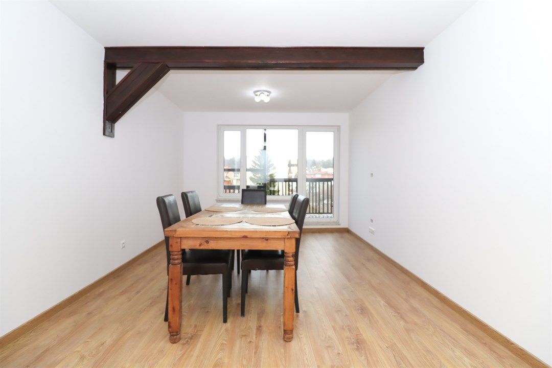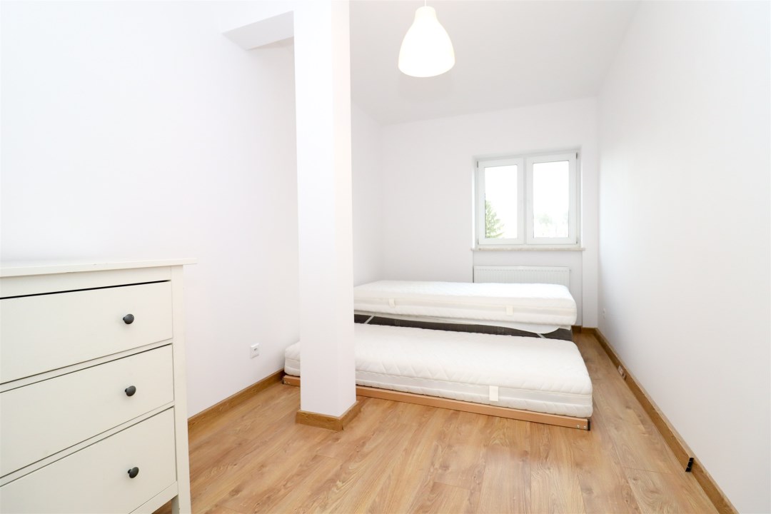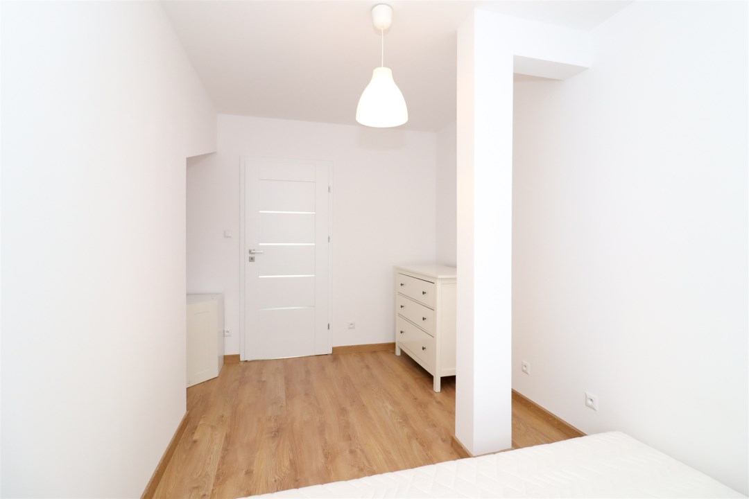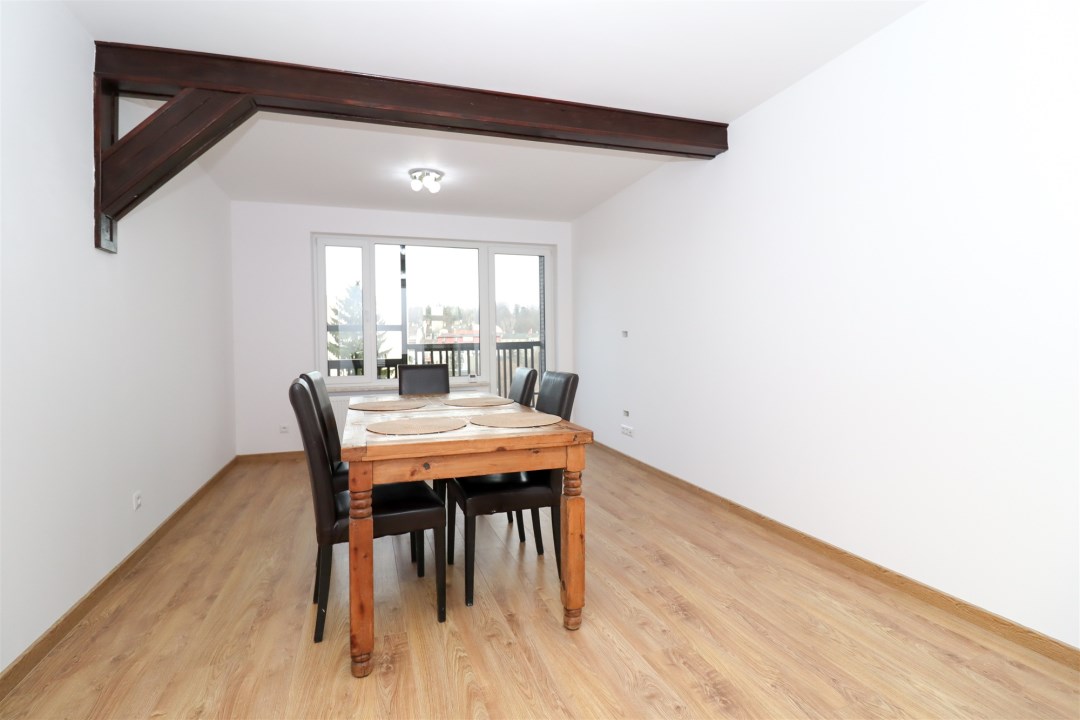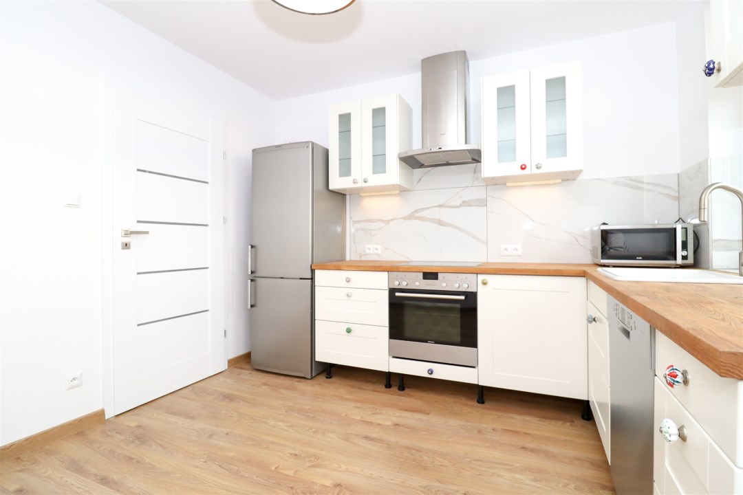 Mieszkanie to powierzchnia 60 m2. Salon wyposażony w duży drewniany stół z krzesłami. Jest idealnie doświetlony przez okna prowadzące na duży balkon. Kuchnia zabudowana nowoczesnymi meblami, wyposażona w bardzo dobry sprzęt AGD (lodówka, piekarnik, płyta elektryczna, pochłaniacz, zmywarka). Dodatkowo, wygospodarowano miejsce na stół z krzesłami. Sypialnia wyposażona w wygodne materace oraz komodę i szafkę. Łazienka z WC wyłożona glazurą i terakotą, wyposażona w prysznic, umywalkę, toaletę. Mieszkanie częściowo umeblowane.
