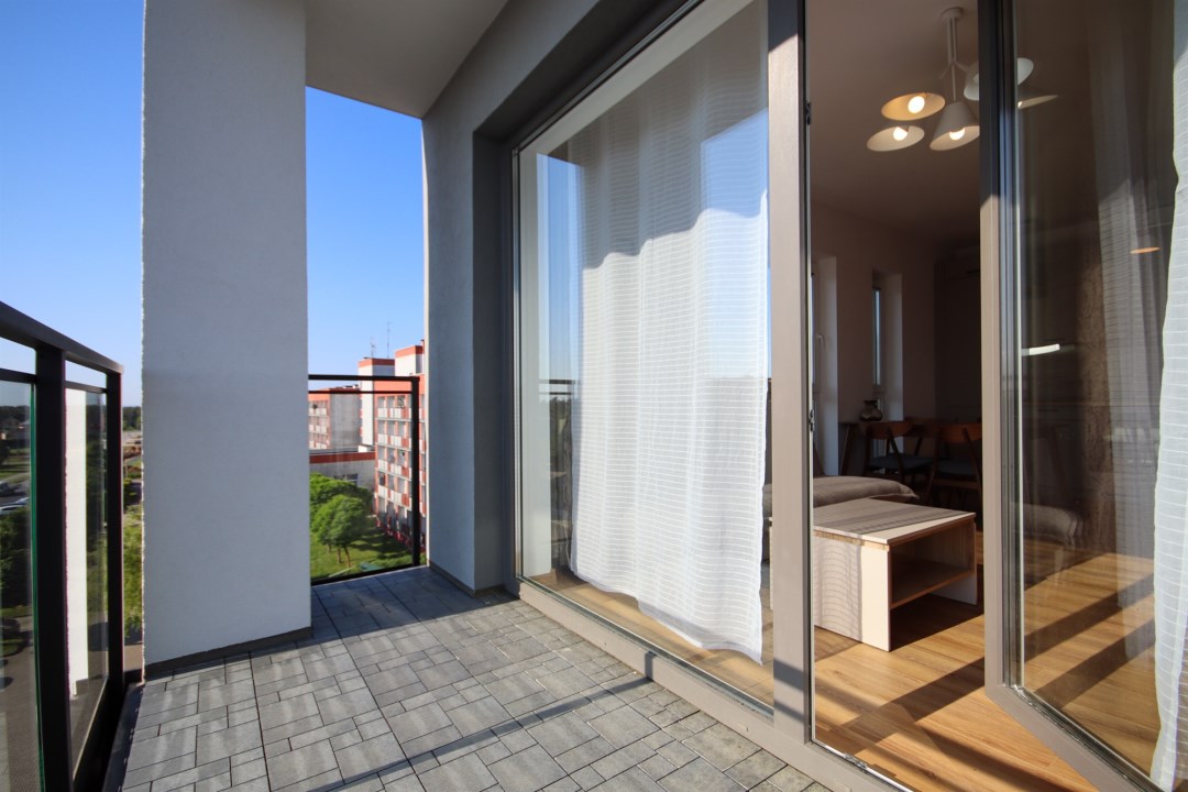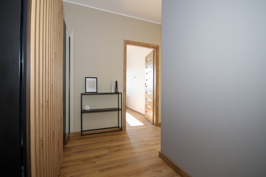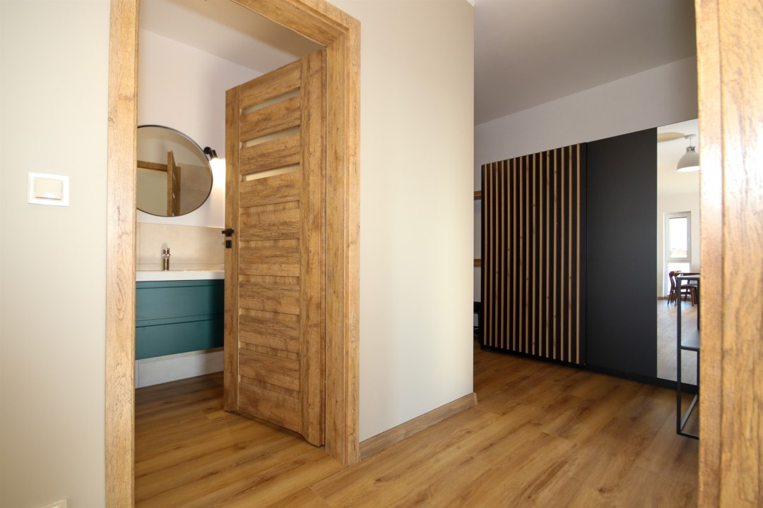 Mieszkanie to powierzchnia 57m2, na którą składa się korytarz wyposażony w funkcjonalne szafy w zabudowie, pokój dzienny łączący się z przestronną kuchnią, dwie sypialnie oraz łazienka z WC wyłożona przepiękną glazurą i terakotą. Kuchnia wyposażona w podstawowy, bardzo dobrej jakości sprzęt AGD: lodówka, zmywarka, piekarnik elektryczny, płyta indukcyjna, pochłaniacz. Do mieszkania przynależy balkon.