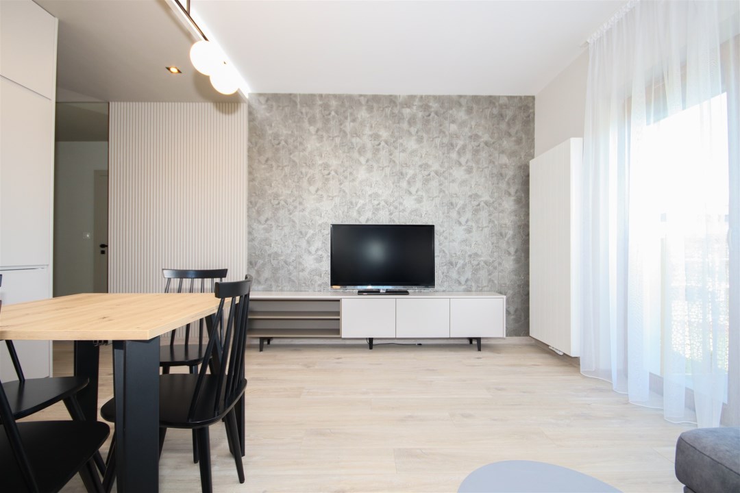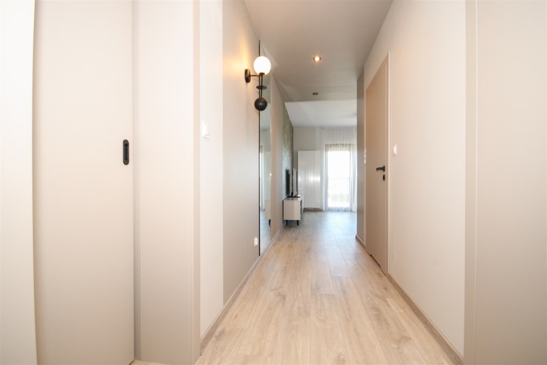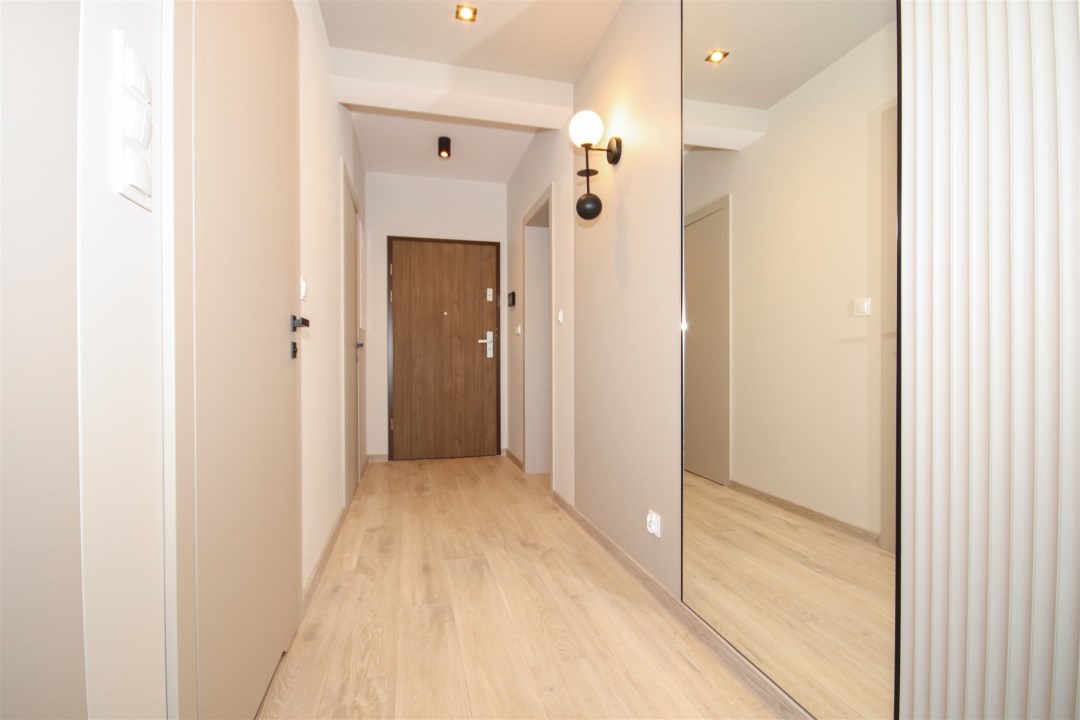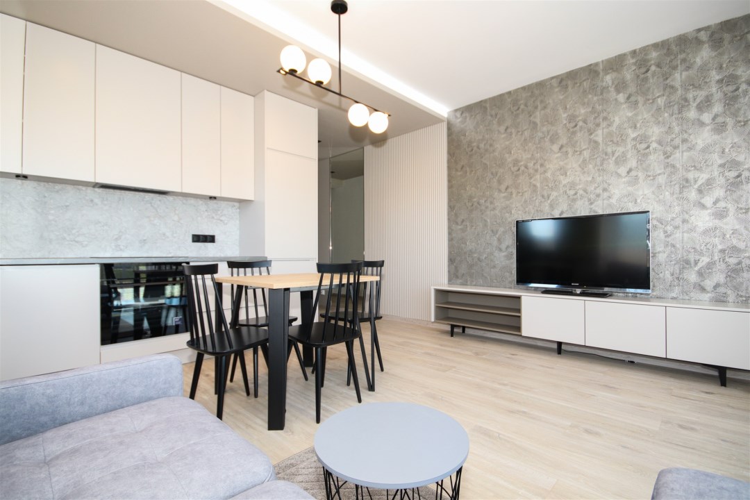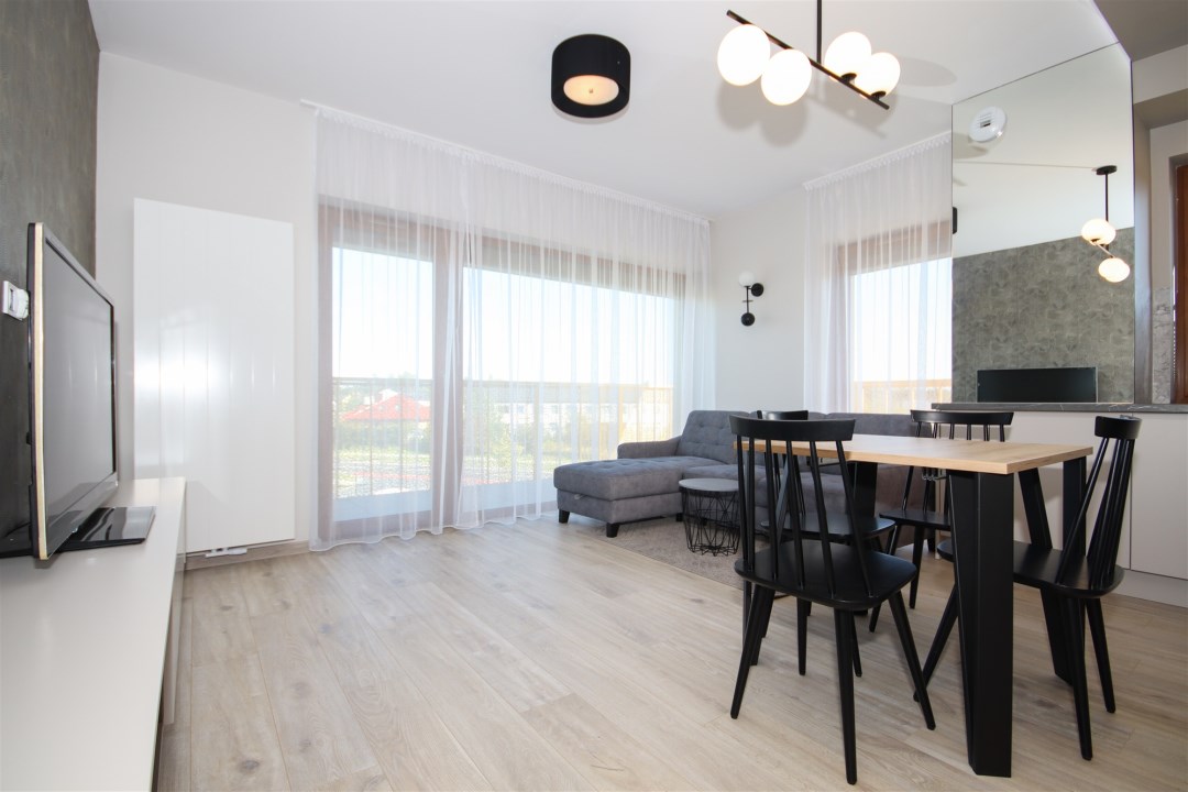 Apartament to powierzchnia 48m2. Salon z kuchnią to otwarta przestrzeń, podzielona na strefy użytkowe w sposób naturalny oraz bardzo harmonijny. Powierzchnia, która jest równocześnie salonem, kuchnią oraz miejscem do odpoczynku. Kuchnia zabudowana nowoczesnymi meblami, wyposażona w bardzo dobry sprzęt AGD (lodówka, kuchenka, płyta indukcyjna, pochłaniacz, zmywarka. Przestrzeń wypoczynkowa - salon wyposażony w wygodną sofę, stolik oraz dodatkowo, wygospodarowano miejsce na stolik z krzesłami, przy których wygodnie można usiąść. Salon idealnie doświetlony przez okna prowadzące na balkon. Sypialnia wyposażona w wygodne łóżko, dużą szafę. Łazienka z WC wyłożona przepiękną glazurą i terakotą, wyposażona w kabinę prysznicową, umywalkę, toaletę. W łazience jest ogrzewanie podłogowe. Apartament wynajmowany z wyposażeniem widocznym na zdjęciach. Budynek „Słoneczne Wzgórze” sąsiaduje bezpośrednio z terenami rekreacyjnymi i osiedlami domów jednorodzinnych. W promieniu 500 m od inwestycji znajdują się najważniejsze punkty miejskiej infrastruktury: szkoła, przedszkole, szpital, przychodnia, park handlowy, 2 markety spożywcze, punkty usługowe, place zabaw, market budowlany. Wyjątkowa lokalizacja daje wiele możliwości spędzania wolnego czasu w otoczeniu przyrody. Bliskość ścieżek rowerowych do okolicznych miejscowości sprzyja aktywnym formom spędzania czasu wolnego.