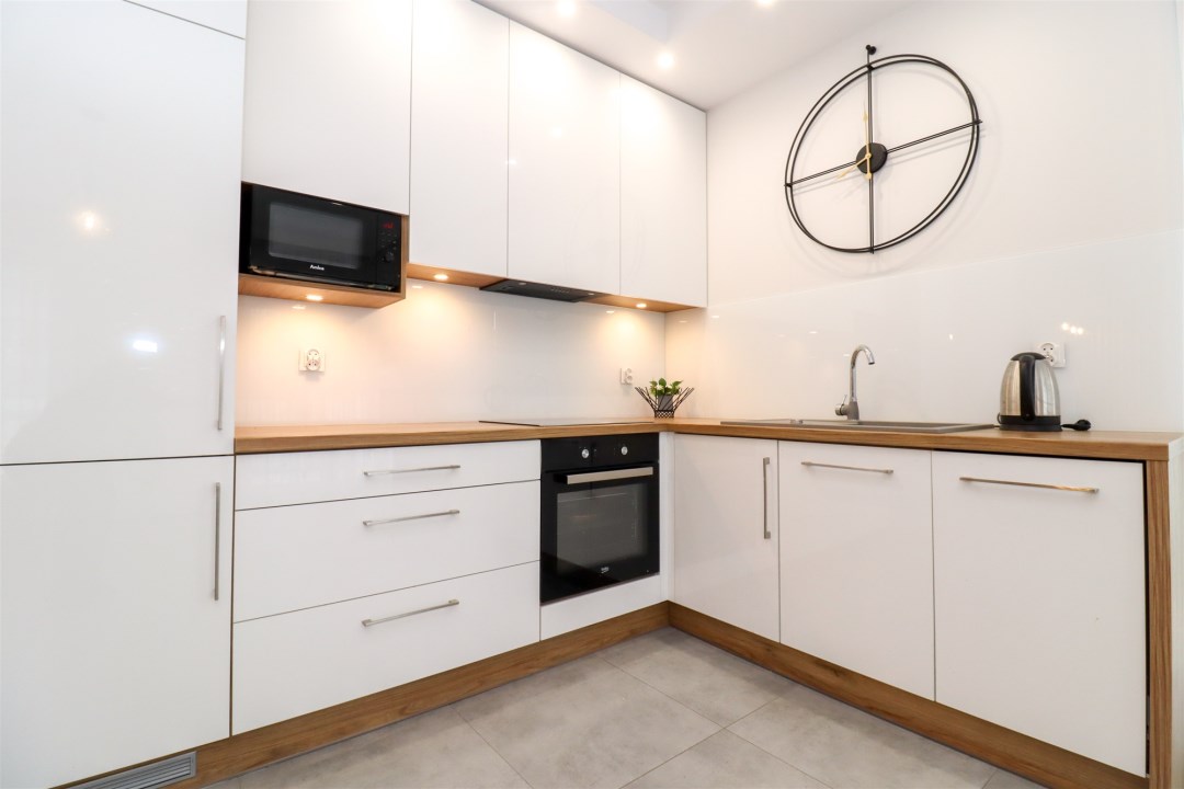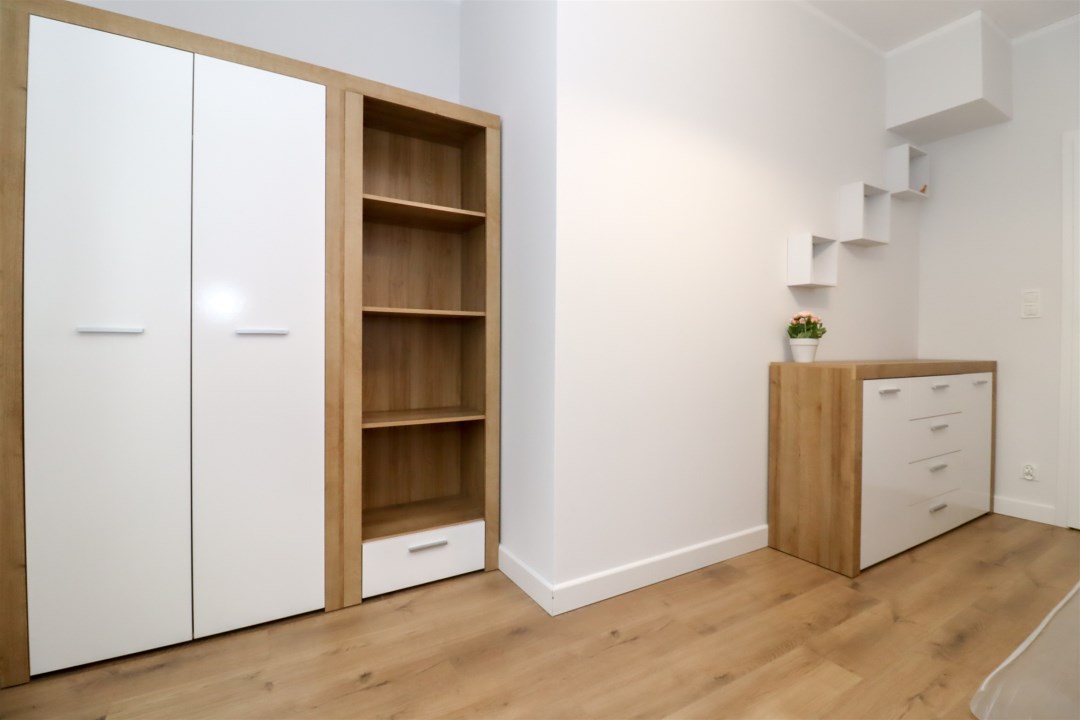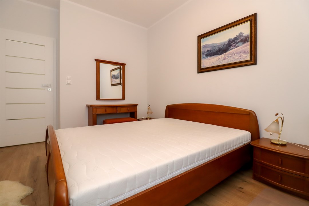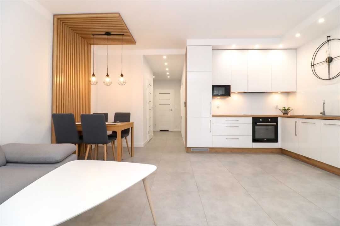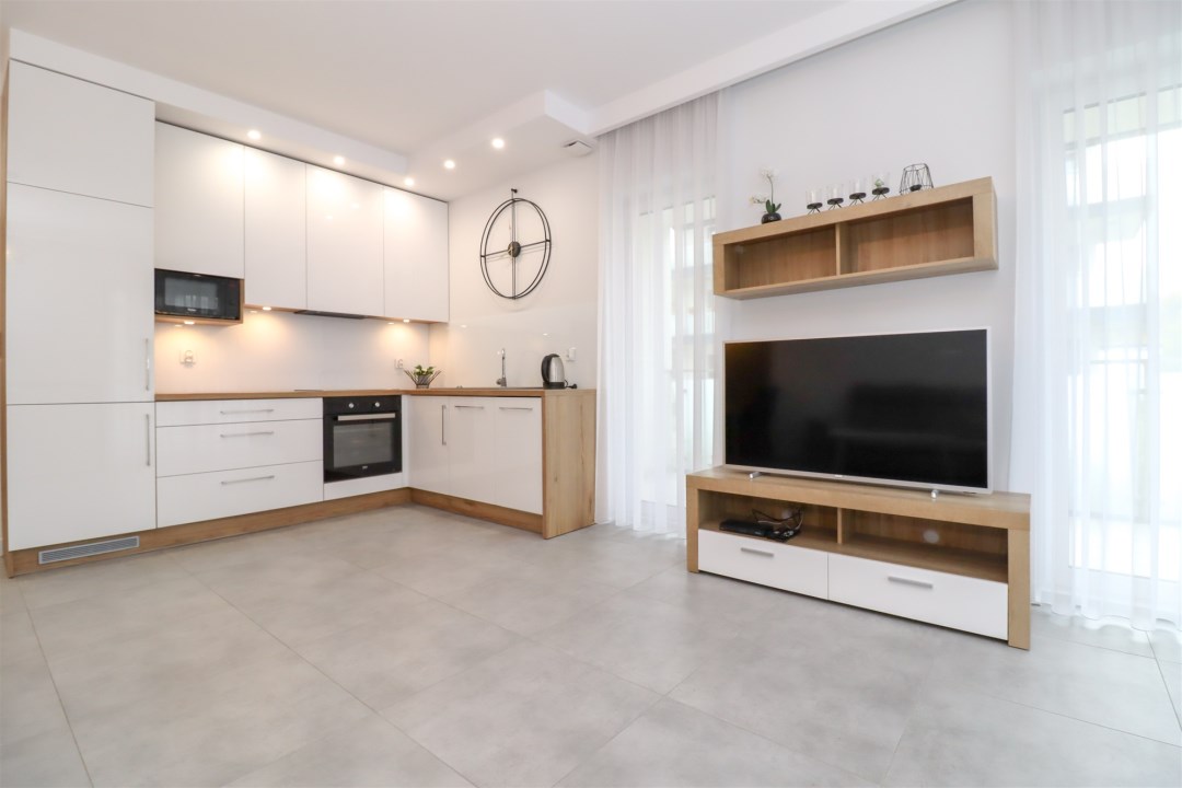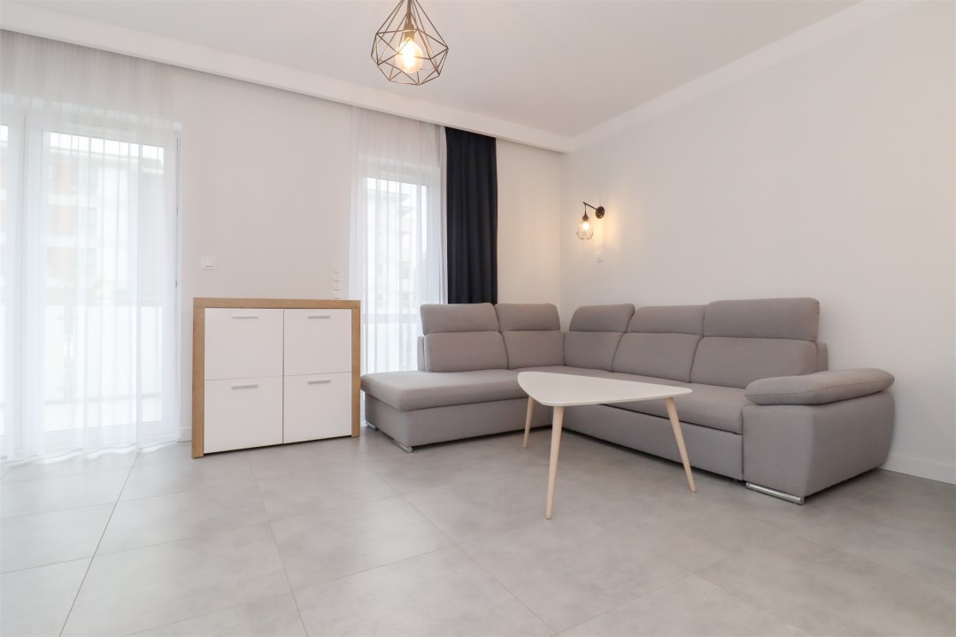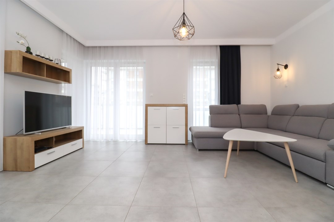 Mieszkanie to powierzchnia 64 m2. Salon z aneksem kuchennym to otwarta przestrzeń, podzielona na strefy użytkowe w sposób naturalny oraz bardzo harmonijny. Powierzchnia, która jest równocześnie salonem, kuchnią oraz miejscem do odpoczynku. Kuchnia zabudowana nowoczesnymi meblami, wyposażona w bardzo dobry sprzęt AGD (lodówka, kuchenka, płyta indukcyjna, pochłaniacz, zmywarka). Przestrzeń wypoczynkowa - salon wyposażony w wygodny narożnik, stolik, oraz telewizor. Dodatkowo, wygospodarowano miejsce na stół z krzesłami. Salon idealnie doświetlony przez okna prowadzące na duży, przepiękny taras. Sypialnie wyposażone w wygodne, duże łóżka oraz pojemne szafę. Łazienka z WC wyłożona przepiękną glazurą i terakotą, wyposażona w kabinę prysznicową, umywalkę, toaletę i pralkę. Lokal mieszkalny wynajmowany z wyposażeniem widocznym na zdjęciach.