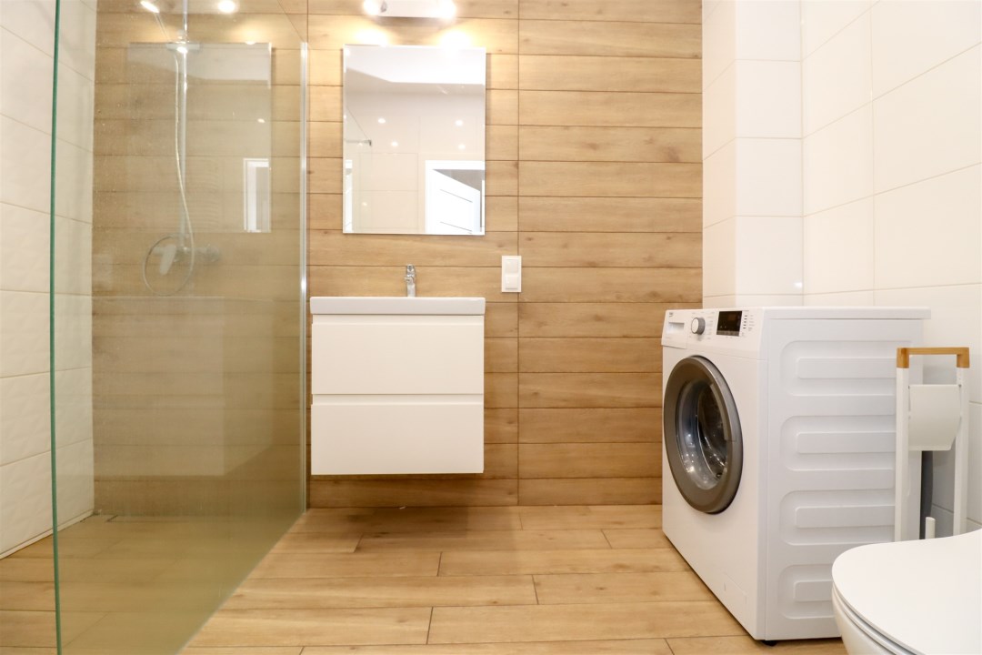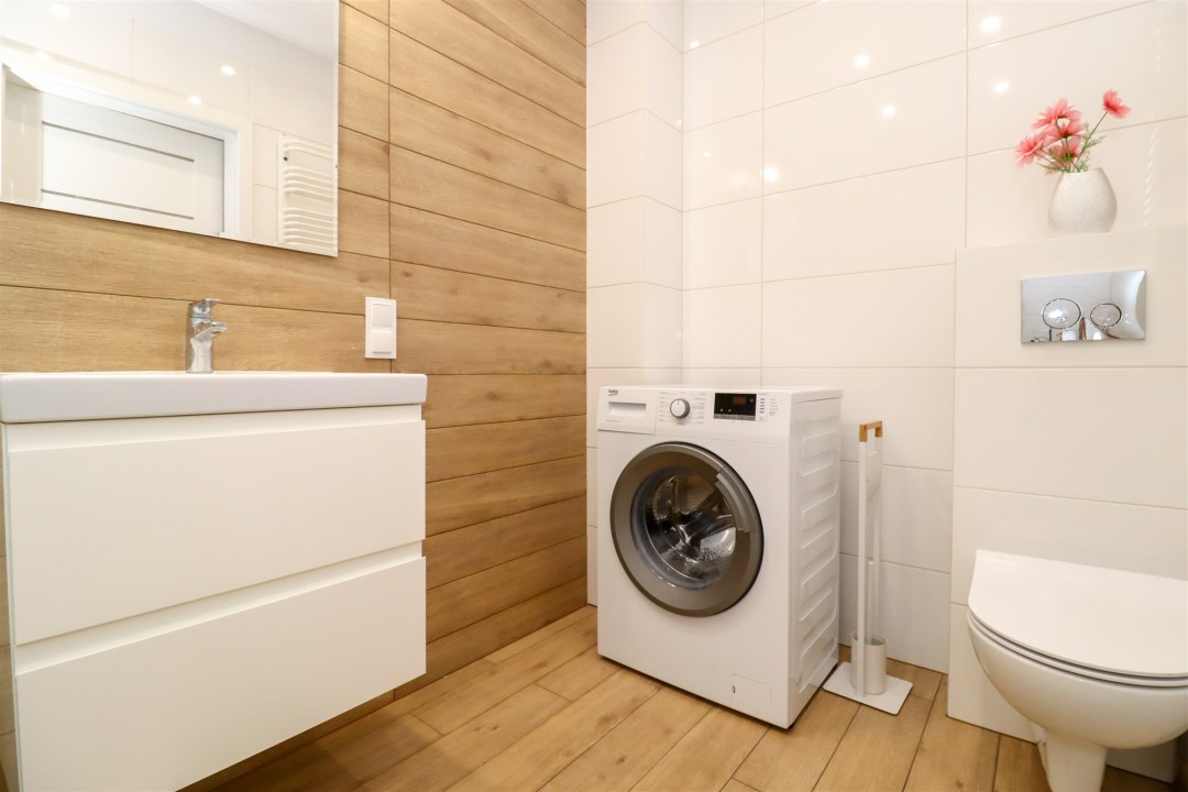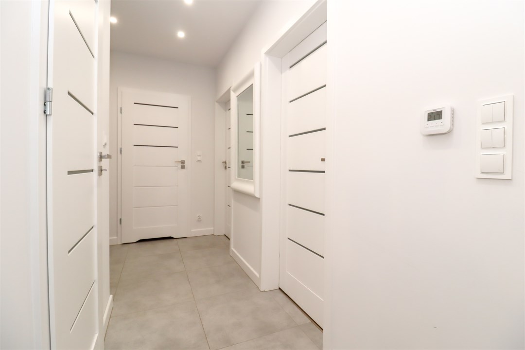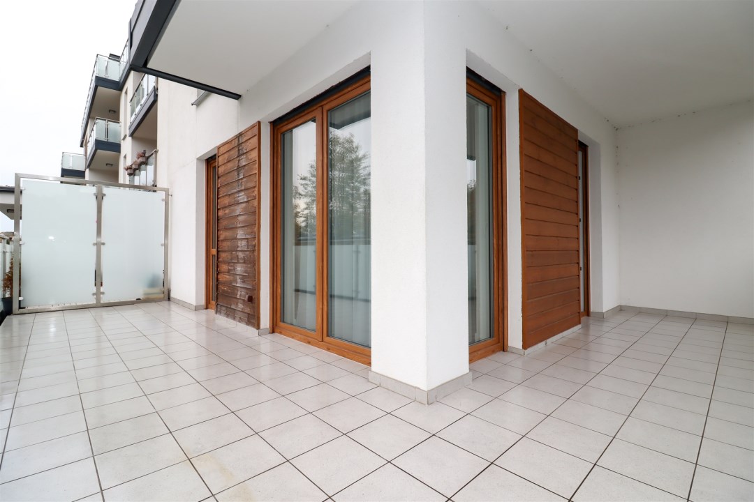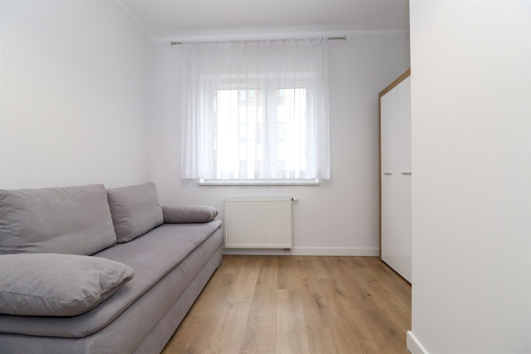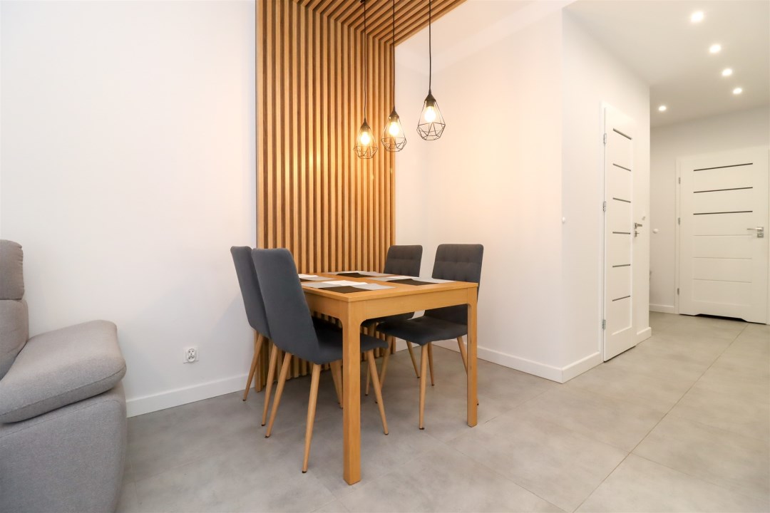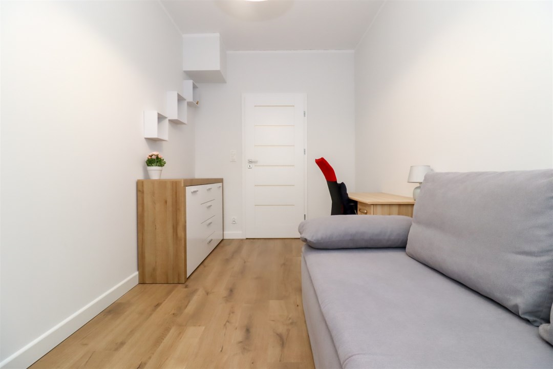 Mieszkanie to powierzchnia 64 m2. Salon z aneksem kuchennym to otwarta przestrzeń, podzielona na strefy użytkowe w sposób naturalny oraz bardzo harmonijny. Powierzchnia, która jest równocześnie salonem, kuchnią oraz miejscem do odpoczynku. Kuchnia zabudowana nowoczesnymi meblami, wyposażona w bardzo dobry sprzęt AGD (lodówka, kuchenka, płyta indukcyjna, pochłaniacz, zmywarka). Przestrzeń wypoczynkowa - salon wyposażony w wygodny narożnik, stolik, oraz telewizor. Dodatkowo, wygospodarowano miejsce na stół z krzesłami. Salon idealnie doświetlony przez okna prowadzące na duży, przepiękny taras. Sypialnie wyposażone w wygodne, duże łóżka oraz pojemne szafę. Łazienka z WC wyłożona przepiękną glazurą i terakotą, wyposażona w kabinę prysznicową, umywalkę, toaletę i pralkę. Lokal mieszkalny wynajmowany z wyposażeniem widocznym na zdjęciach.