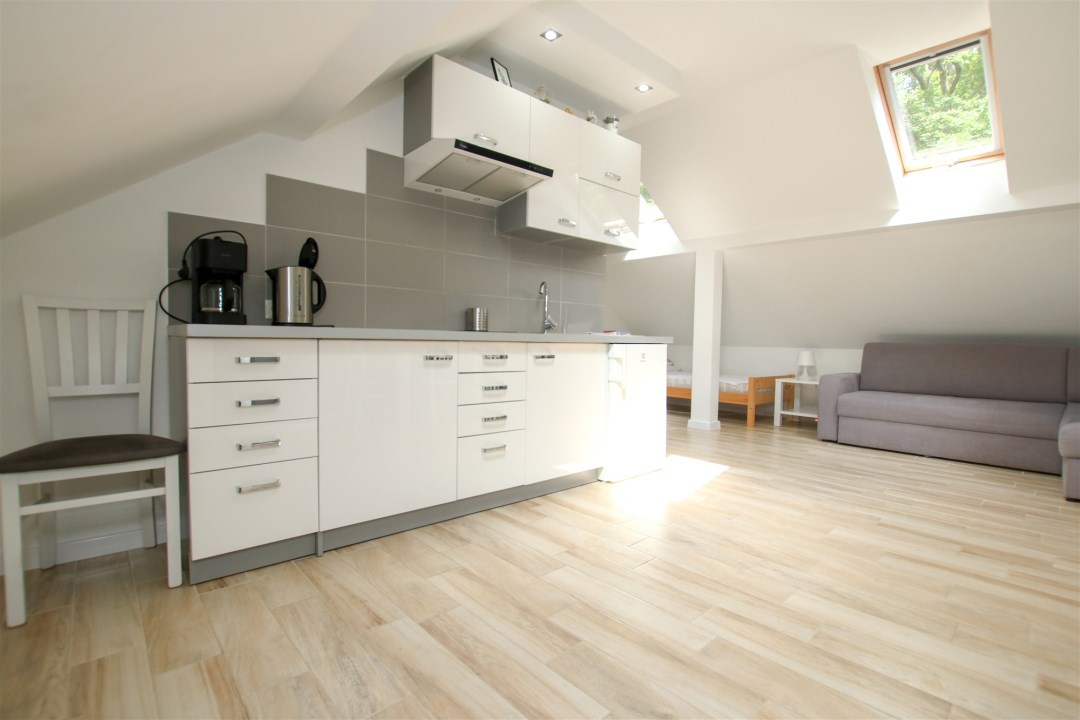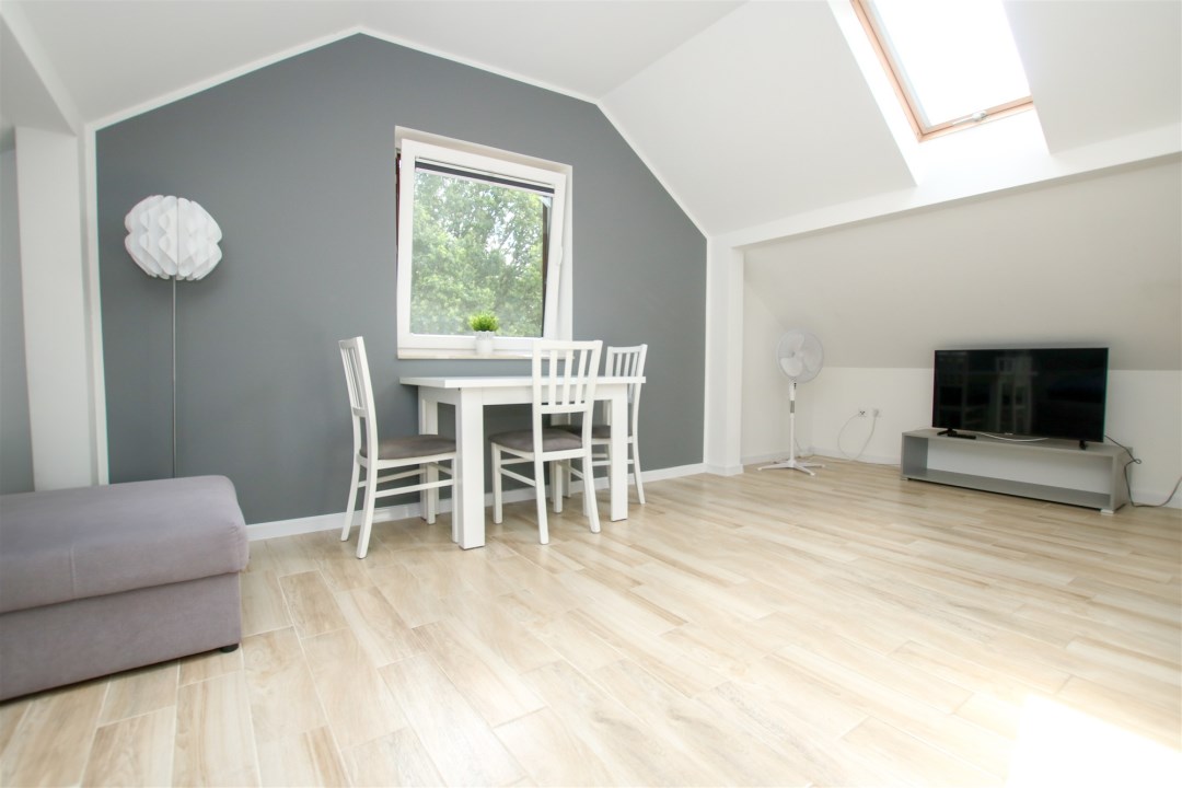Świetna lokalizacja - Dębina to cicha alternatywa dla zatłoczonych kurortów, a jednocześnie bliskość Poddąbia i Rowów daje dostęp do atrakcji turystycznych. Apartament znajduje się na poddaszu.