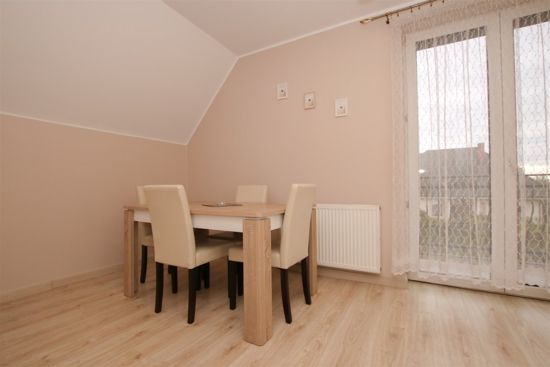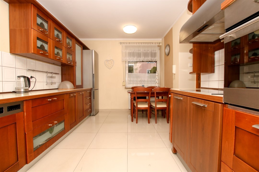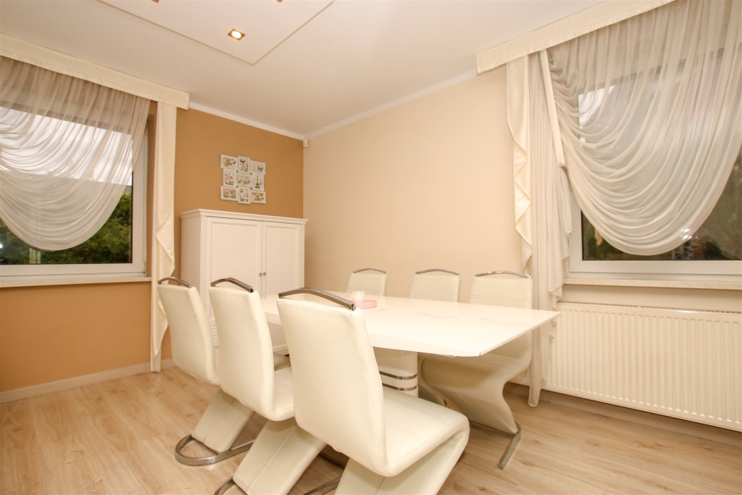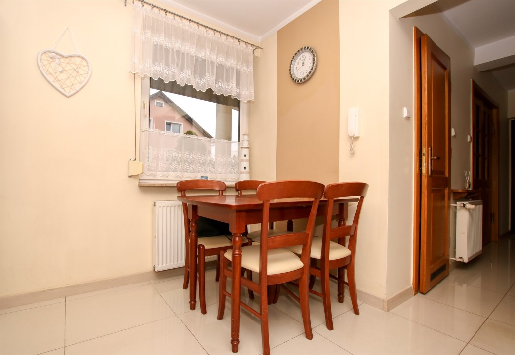 - Kuchnia (12 m²) – funkcjonalna, oddzielna, idealna dla pasjonatów gotowania z dużym stołem z krzesłami.