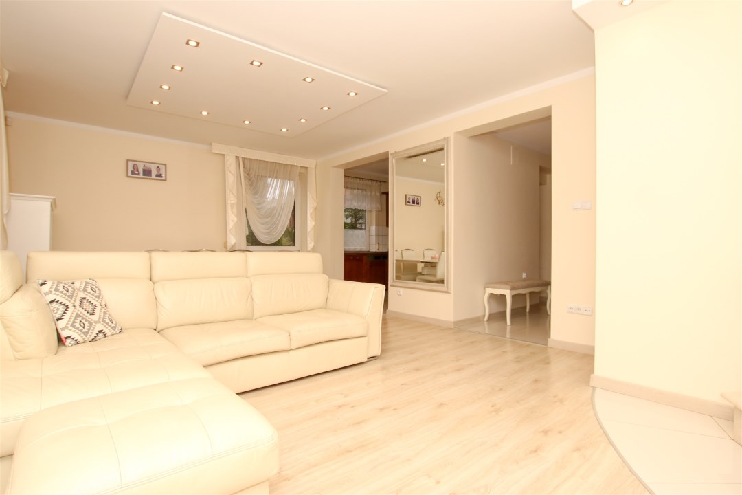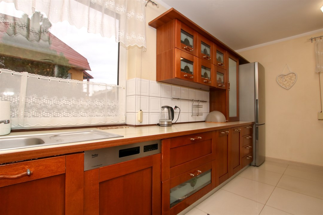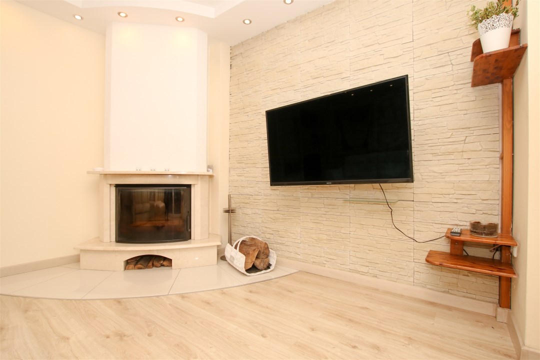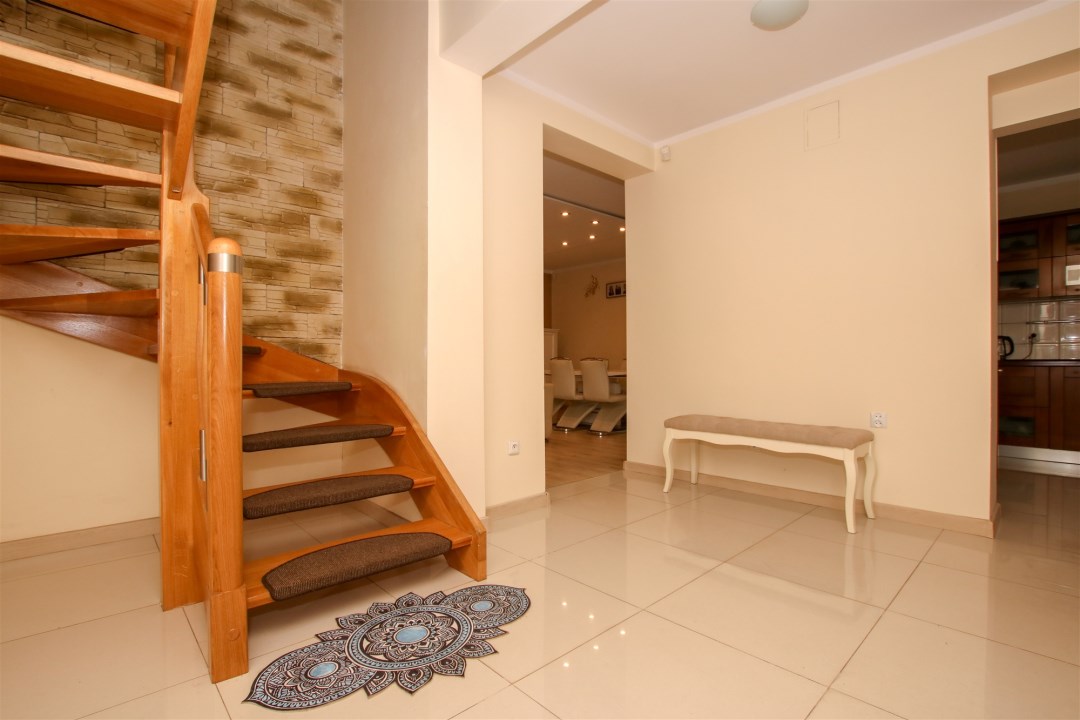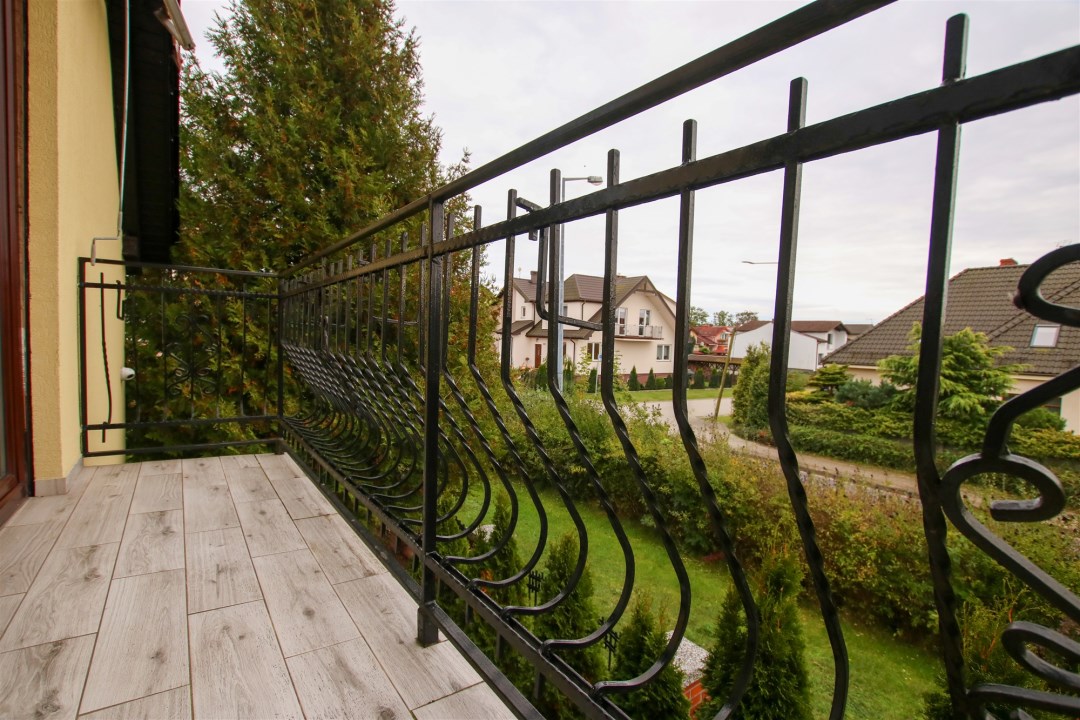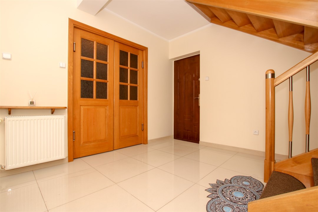 Dom ogrzewany jest piecem na ekogroszek, jednak istnieje możliwość podłączenia ogrzewania gazowego. W salonie znajduje się kominek z płaszczem wodnym, który tworzy wyjątkowy klimat, a jednocześnie wspiera system grzewczy. Na parterze i piętrze zamontowano rolety antywłamaniowe, które zwiększają bezpieczeństwo. Drewniane schody oraz połączenie paneli i płytek na podłogach tworzą solidne i estetyczne wykończenie.