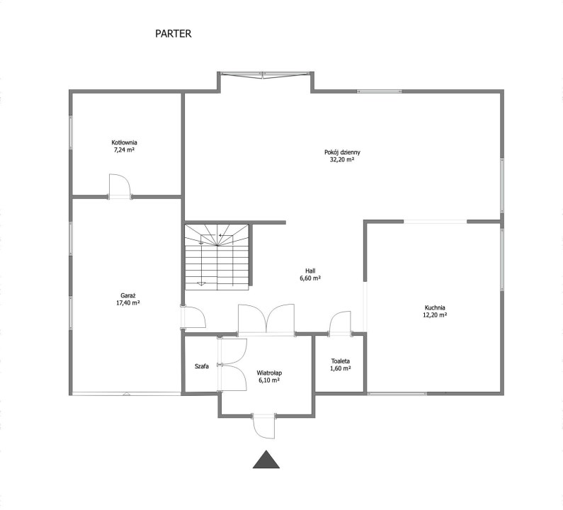 - Hall (6,6 m²) – łączy wszystkie pomieszczenia na parterze.