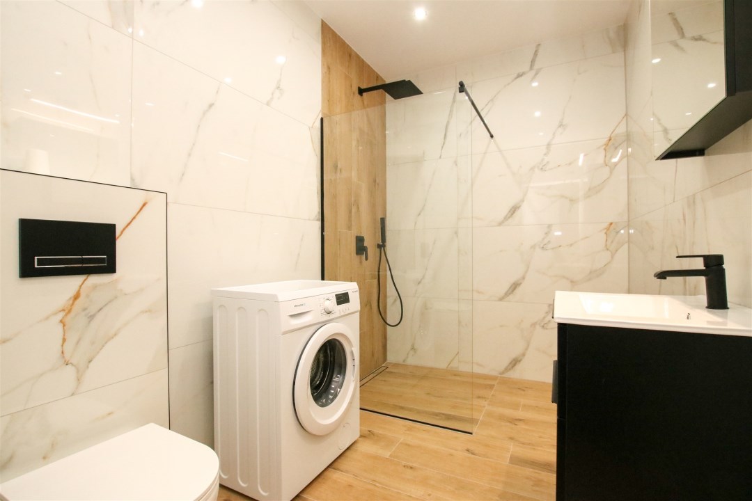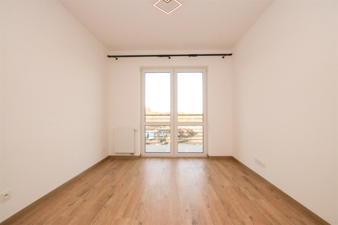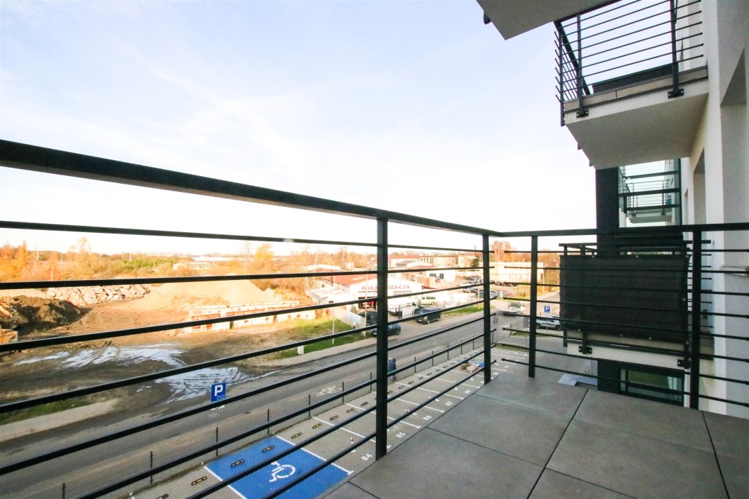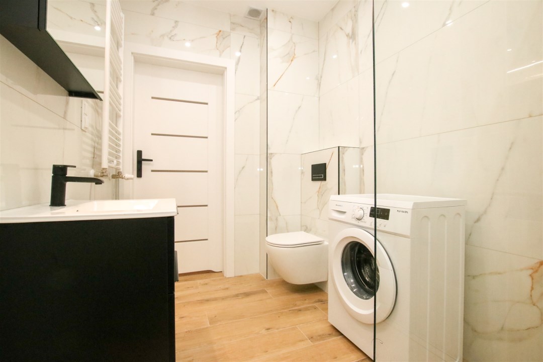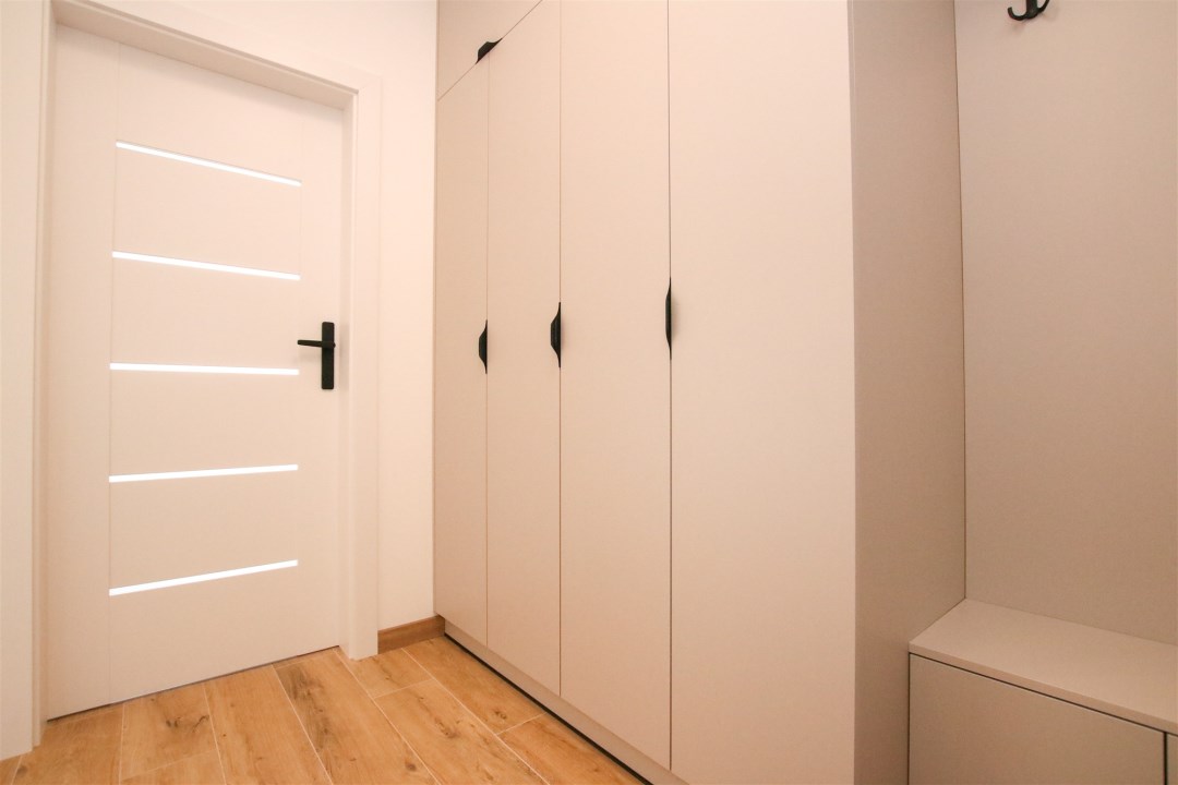 Mieszkanie składa się z przestronnego pokoju dziennego, w którym znajduje się wygodny aneks kuchenny z nowoczesnymi oraz funkcjonalnymi meblami, wyposażonymi w najpotrzebniejsze sprzęty tj.: lodówka, zmywarka, płyta indukcyjna, czajnik elektryczny oraz pochłaniacz. Pokój dzienny oraz sypialnia bez umeblowania. Z pokoju można wyjść na słoneczny i obszerny balkon, który jest prawdziwym rajem dla miłośników świeżego powietrza i słońca. To idealne miejsce do porannej kawy, czy wieczornego wypoczynku. Mieszkanie posiada także sypialnię. W przedpokoju znajduje się duża szafa, ułatwiająca przechowywanie odzieży wierzchniej, ubrań oraz dodatków. Łazienka to prawdziwa perełka tego mieszkania. Została zaprojektowana w każdym detalu. W całości wyłożona jasną glazurą i terakotą. Wyposażona w prysznic typu walk-in, umywalkę z szufladami, toaletę i pralkę.
