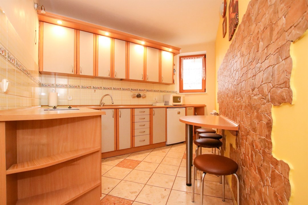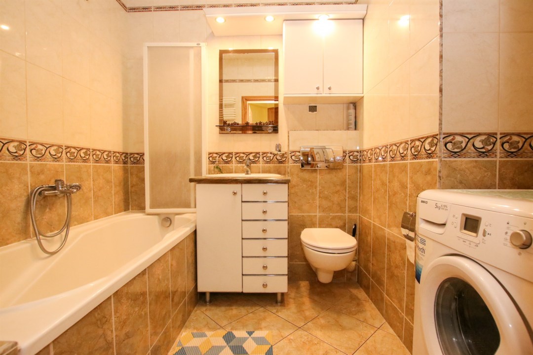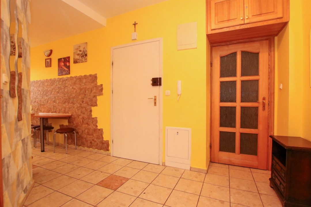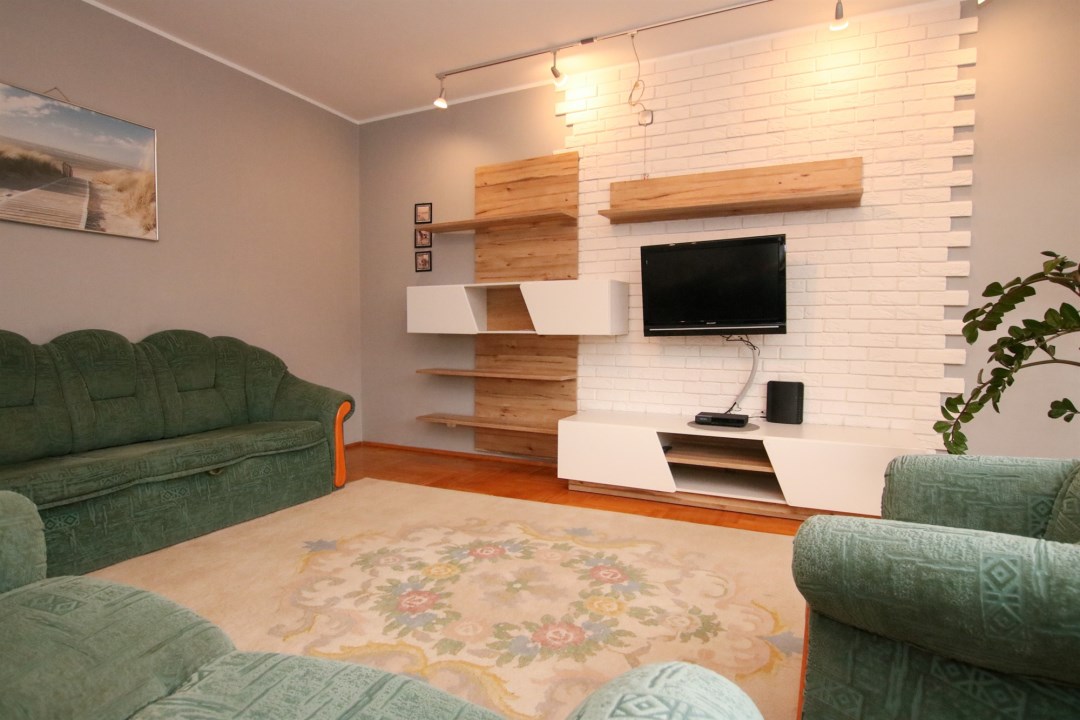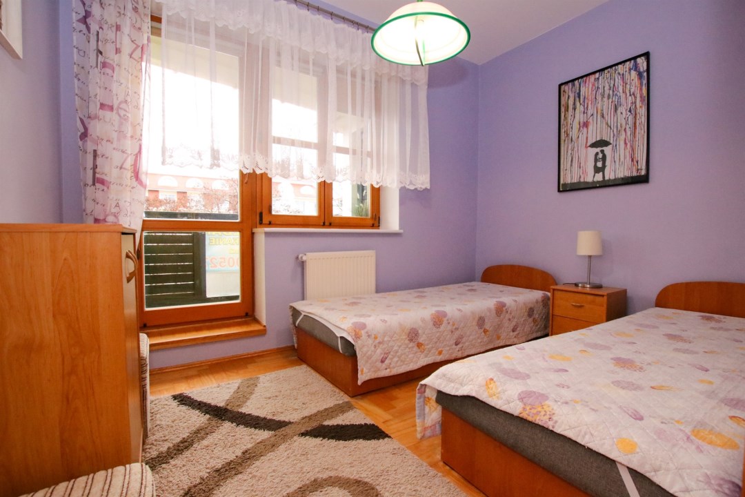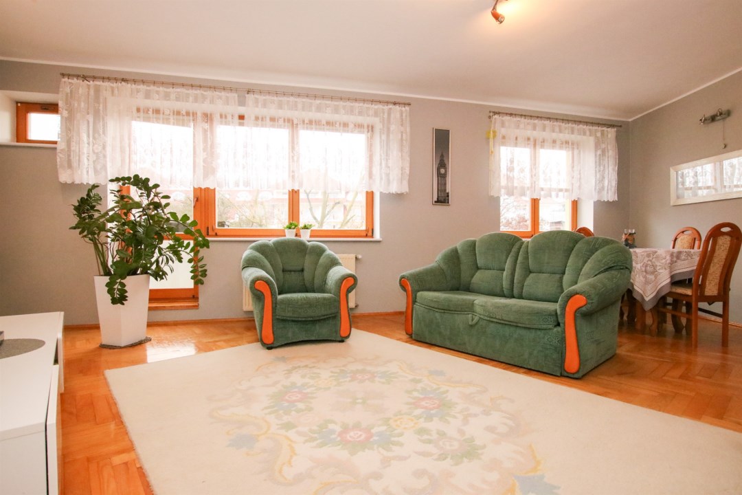 W mieszkaniu znajdują się dwa przestronne pokoje, duży salon z widokiem na zieleń, funkcjonalna kuchnia z jadalnią, łazienka z wanną oraz wygodna garderoba. Drewniane okna nowego typu podkreślają standard wykończenia, a naturalne kolory wnętrz tworzą ciepły i przytulny klimat. Stan lokalu pozwala na wprowadzenie się od razu, bez konieczności większych nakładów.