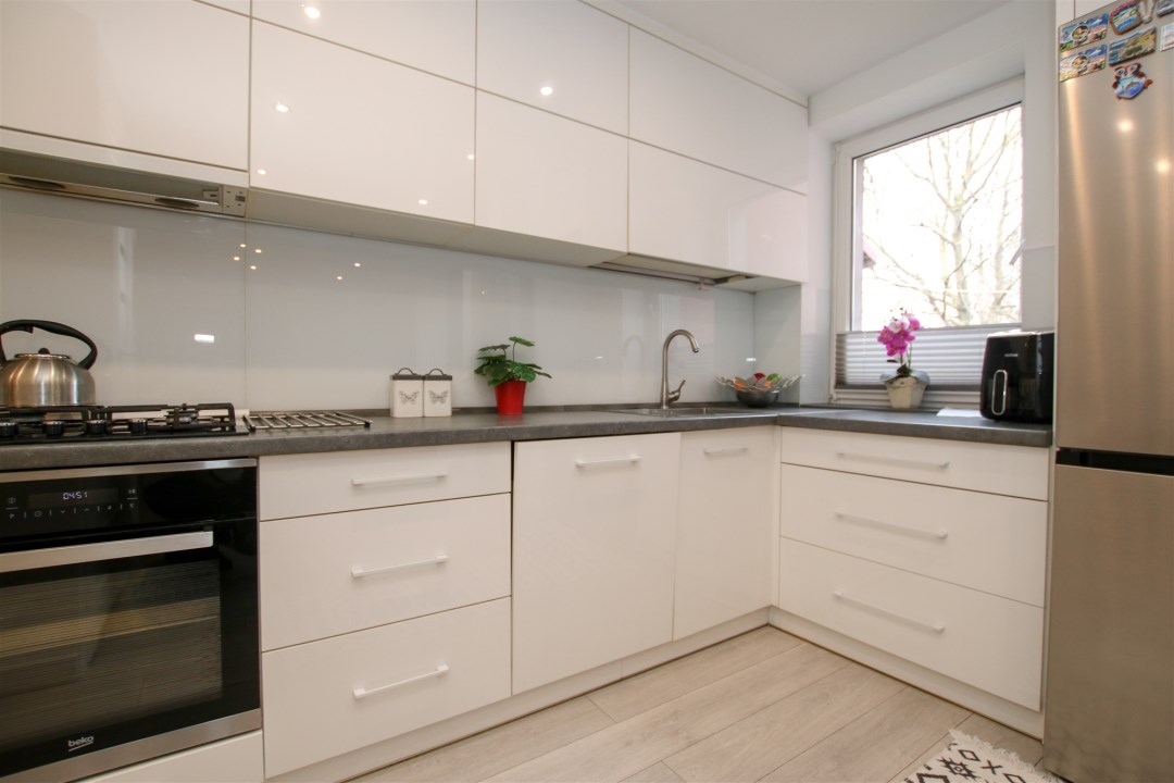 Mieszkanie wyposażone jest w jasną, nowoczesną kuchnię z białymi meblami w zabudowie. Przestrzeń została zaprojektowana tak, by łączyć estetykę z funkcjonalnością – wszystko ma tu swoje miejsce, a wysokiej jakości zabudowa podkreśla elegancki charakter wnętrza.
