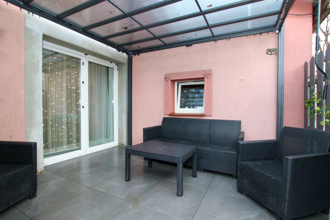 Z salonu prowadzi bezpośrednie wyjście na taras, który pozwala cieszyć się świeżym powietrzem o każdej porze dnia – idealny na poranną kawę lub wieczorny relaks.