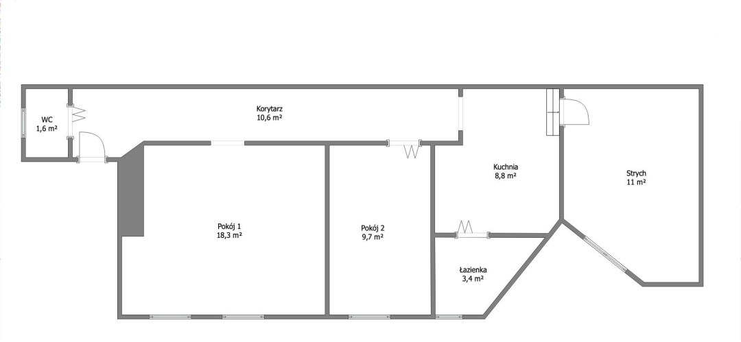 Z przestronnego korytarza (10,6 m²) prowadzą wejścia do widnego WC (1,6 m²), dwóch niezależnych pokoi – większego (18,3 m²), idealnego na salon z widokiem na rzekę, oraz mniejszego (9,7 m²), który sprawdzi się jako sypialnia, gabinet lub pokój dziecięcy. Funkcjonalna kuchnia (8,8 m²) łączy się z łazienką (3,4 m²) oraz z dodatkową przestrzenią strychową o powierzchni 11 m², dzierżawioną zgodnie z Uchwałą Wspólnoty Mieszkaniowej. Powierzchnię tę można łatwo zaadaptować na dodatkowy pokój, kuchnię z jadalnią lub pracownię, co znacznie zwiększa potencjał lokalu.