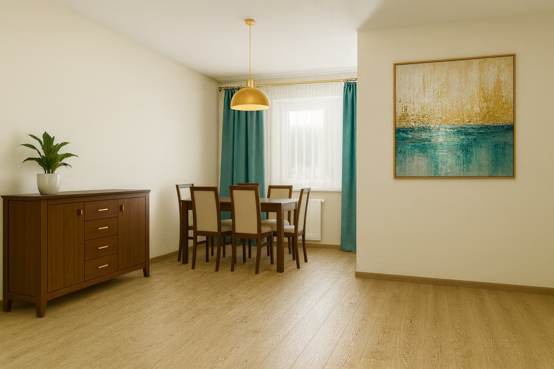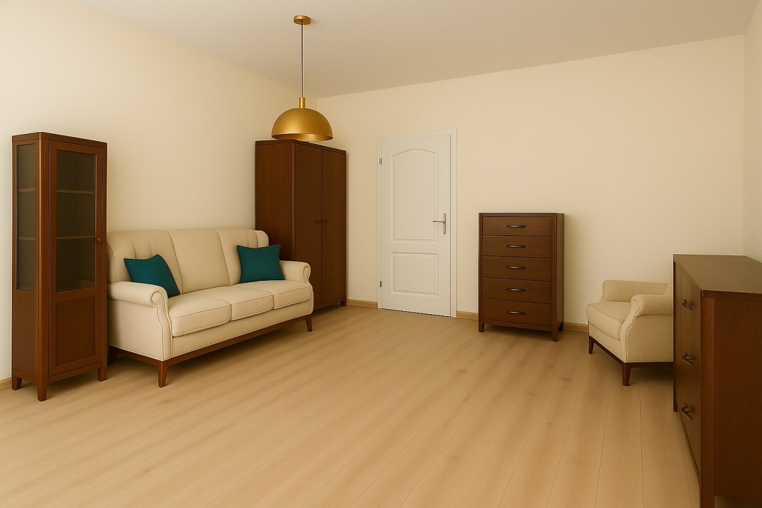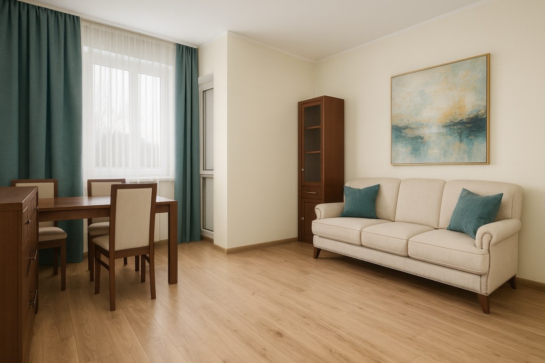Salon jest ustawny i pozwala na dowolną aranżację – idealny dla singla, pary lub rodziny.