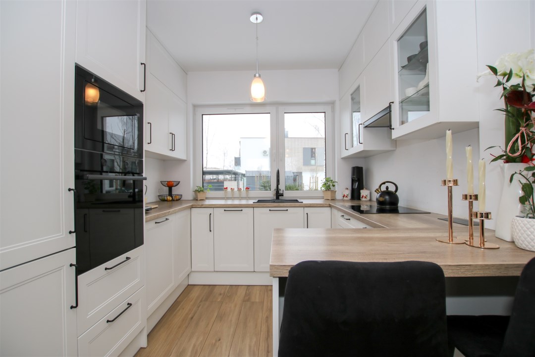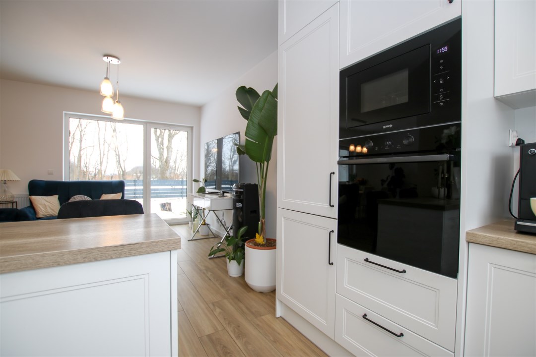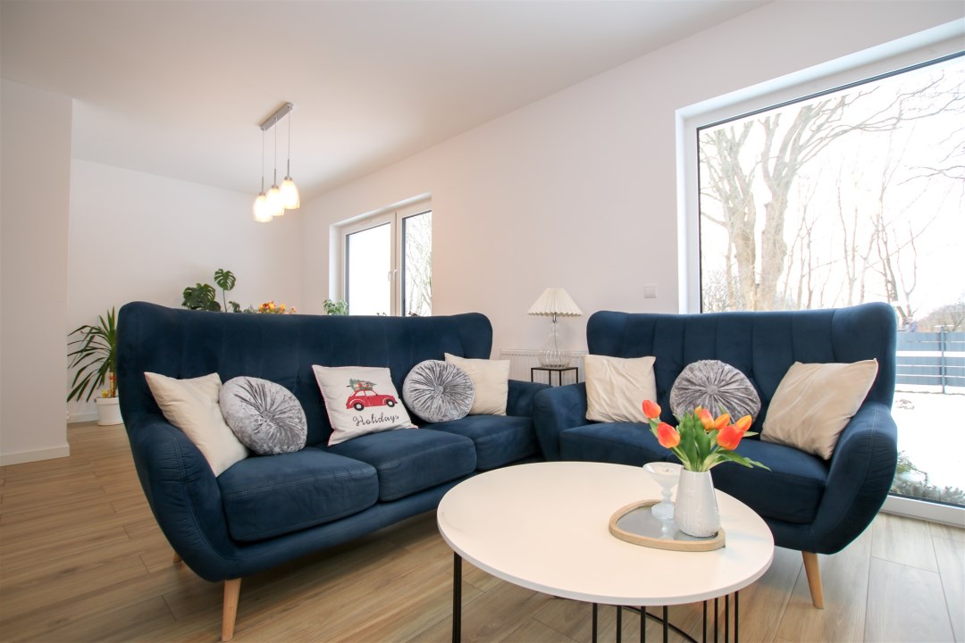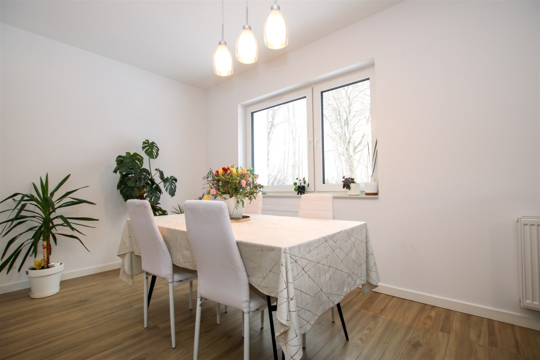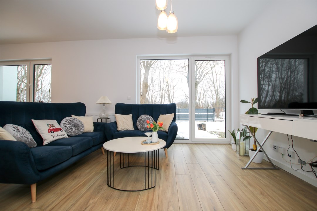 Dom, na który składa się ustawny salon wyłożony gresem, wyposażony w wygodną sofę, stół z krzesłami, telewizor. Duże okna balkonowe sprawiają, że w pomieszczeniu jest słonecznie przez cały dzień. Z salonu jest wyjście do pięknego ogrodu z tarasem. Kuchnia zabudowana meblami na wymiar, a także wyposażona w sprzęt AGD i RTV tj. lodówkę, płytę indukcyjną, piekarnik, mikrofalówkę, okap kuchenny oraz zlew z baterią. Na parterze znajduje się również toaleta oraz przedpokój. Pod schodami jest dodatkowa przestrzeń na przechowywanie niezbędnych rzeczy.