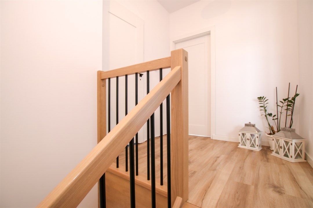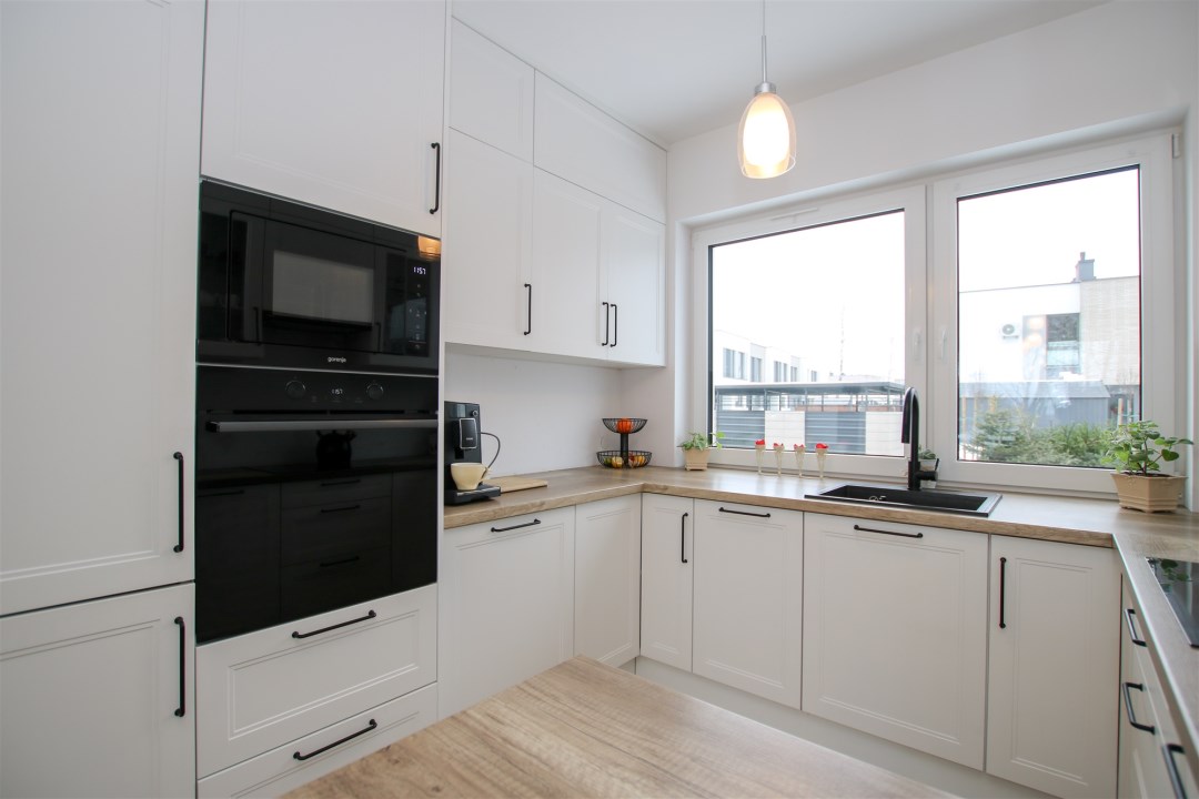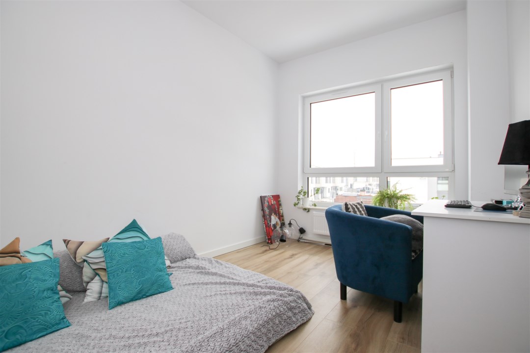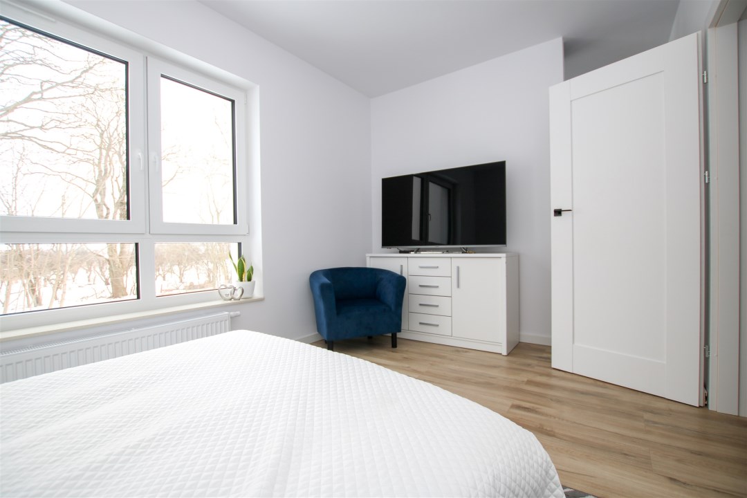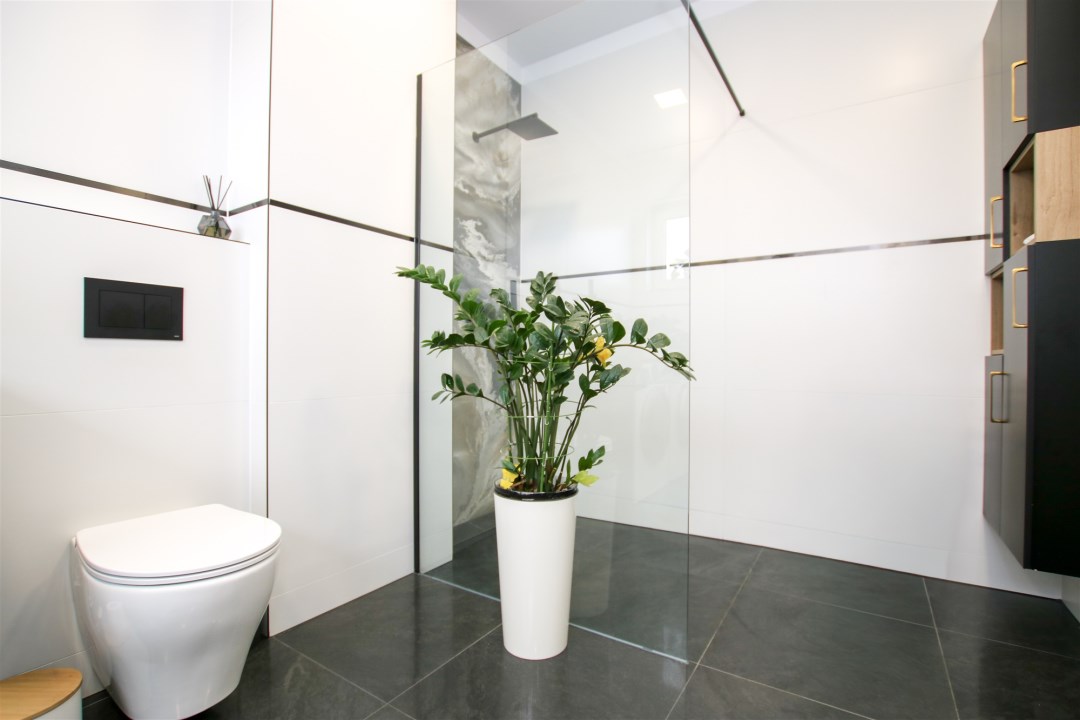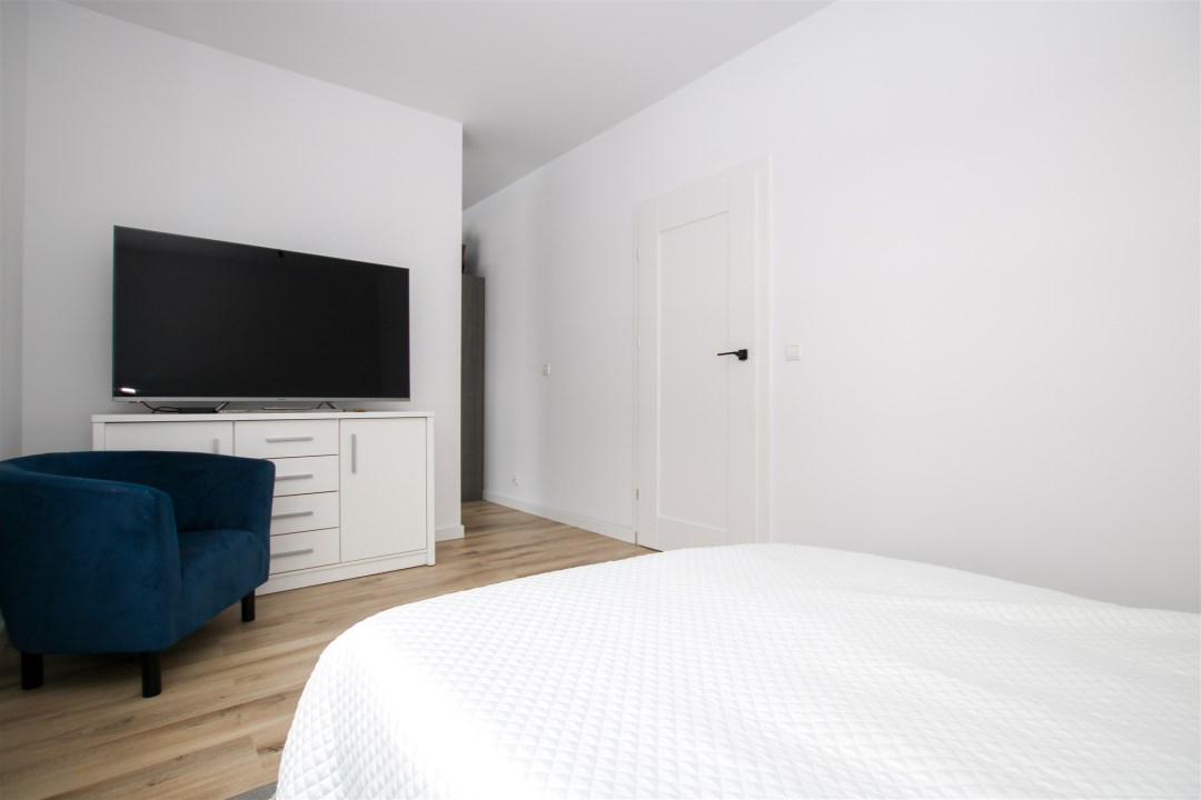 Na piętrze sypialnia jest połączona z garderobą o powierzchni ponad 10m2. W sypialni znajduje się duże podwójne łóżko, szafki nocne a także komoda. Kolejne pomieszczenie stanowi pokój gościnny, który sprawdzi się idealnie jako gabinet. Ostatnim pomieszczeniem na piętrze jest nowoczesna, jasna łazienka w minimalistycznym stylu, wykończona w ponadczasowej kolorystyce bieli, czerni i naturalnego drewna. Duże okno zapewnia doskonałe doświetlenie, a funkcjonalny układ obejmuje przestronny prysznic walk-in oraz wydzieloną strefę pralni z pralką i suszarką. Wysoki standard wykończenia, gotowa do użytkowania.