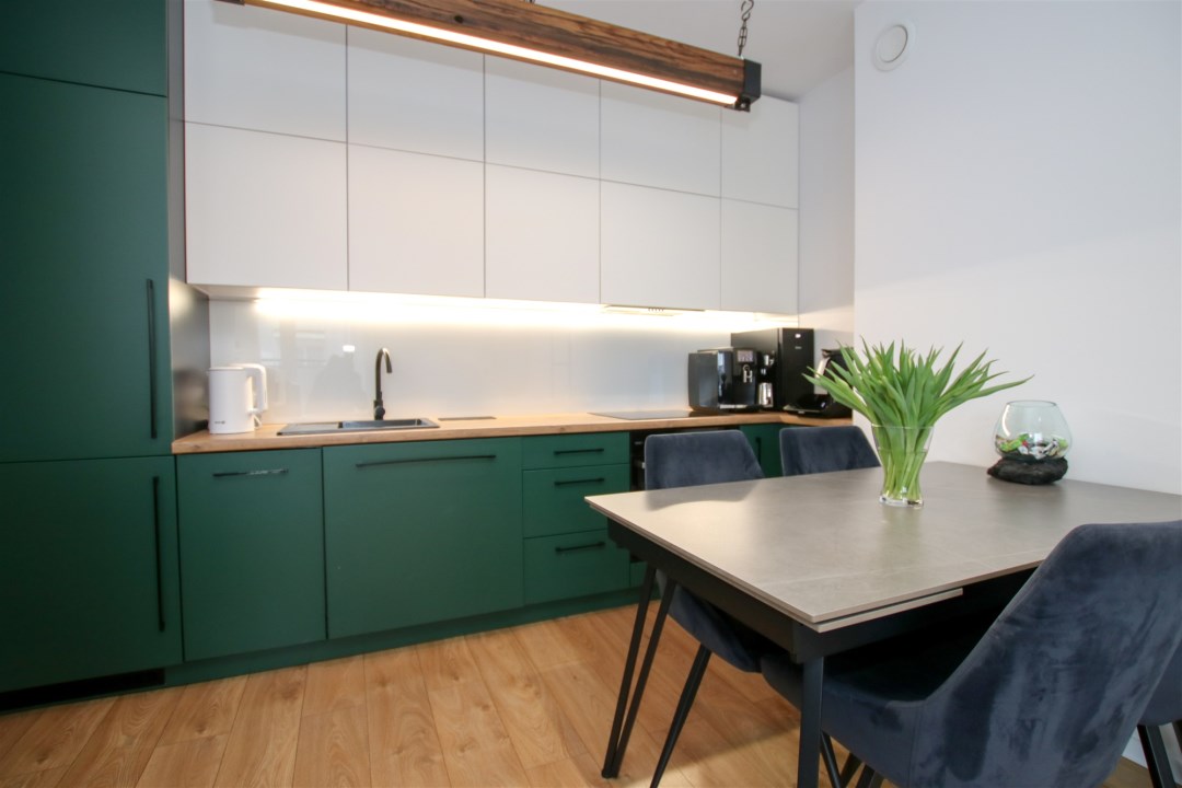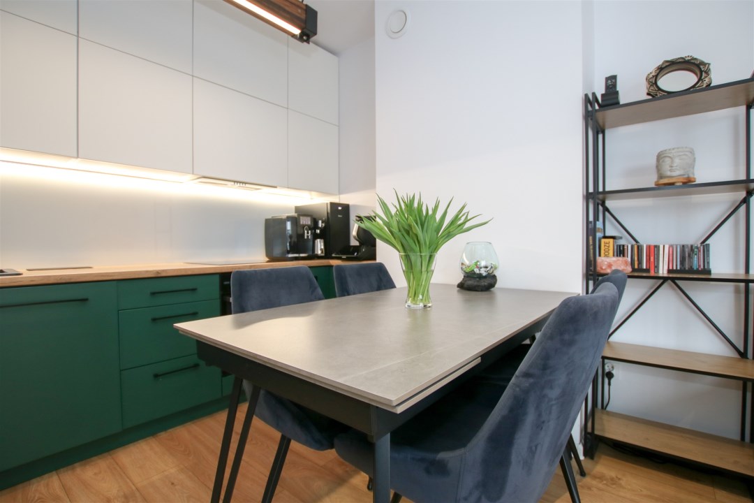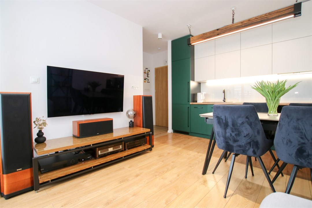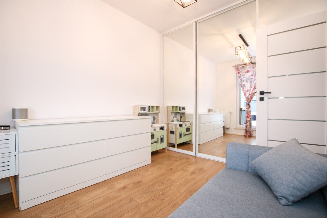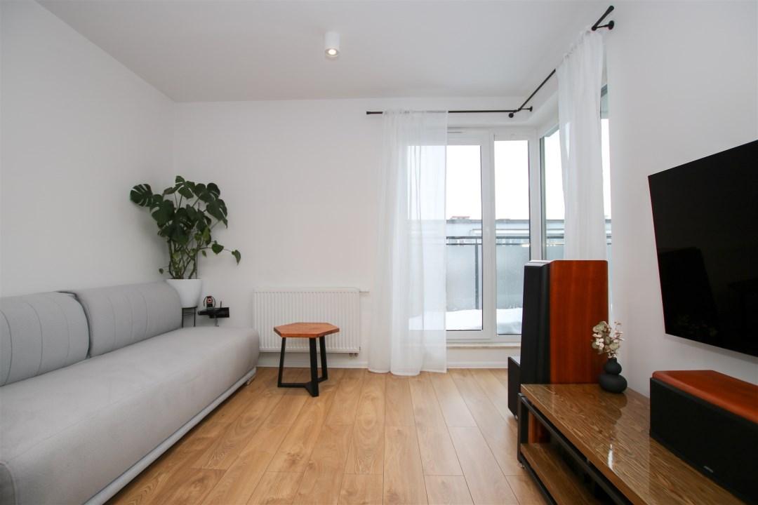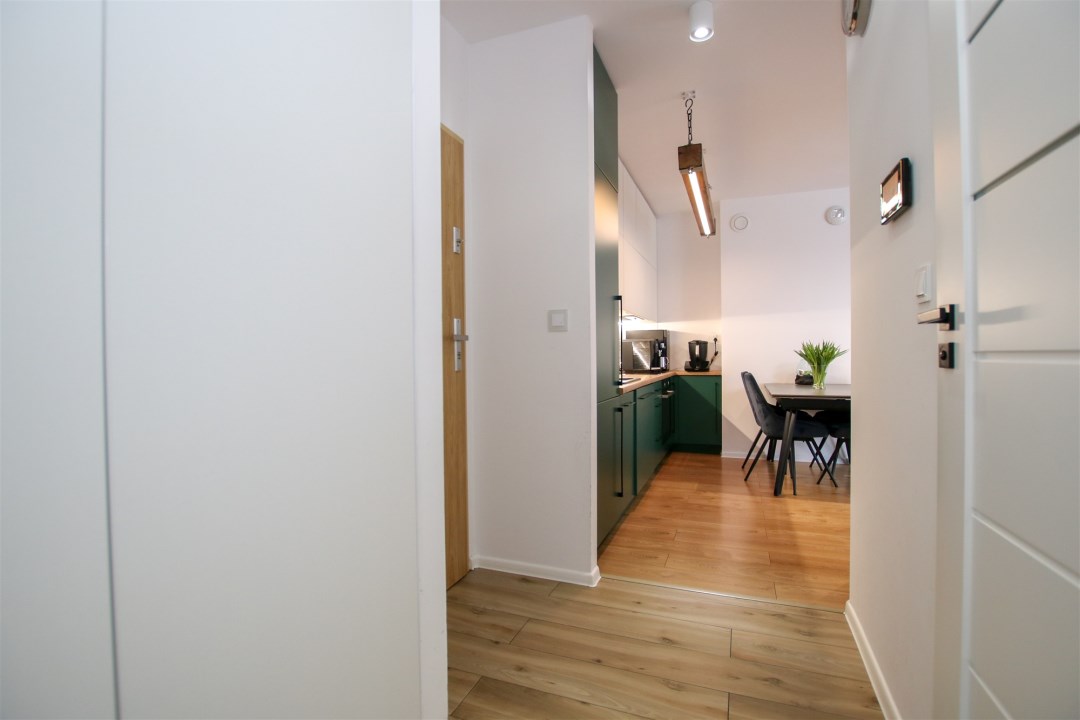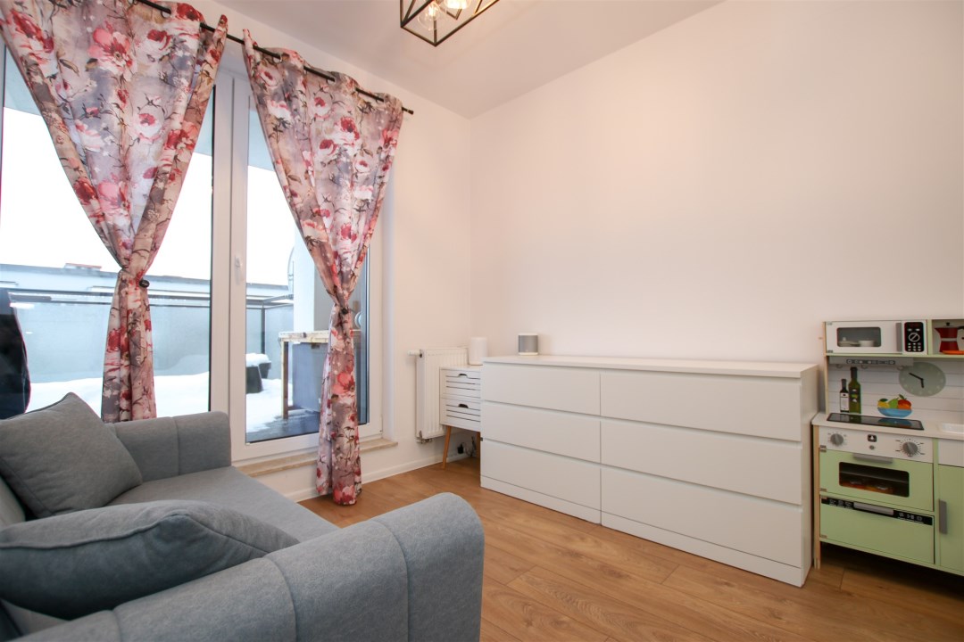 Przestronny pokój dzienny z aneksem kuchennym to idealne miejsce do codziennego życia i spotkań z bliskimi. Część wypoczynkowa wyposażona jest w wygodną sofę, stolik kawowy, szafkę RTV oraz telewizor. Aneks kuchenny zabudowany nowoczesnymi meblami i wyposażony w sprzęt AGD: lodówkę w zabudowie, płytę indukcyjną, piekarnik, okap oraz zlew z baterią. Z salonu prowadzi wyjście na duży taras usytuowany od strony wschodniej. Sypialnia została urządzona z myślą o wygodzie - znajduje się w niej kanapa, szafki oraz pojemna szafa. Łazienka wyposażona w prysznic typu walk-in, umywalkę w zabudowie, pralkę oraz toaletę. Wykończenie w nowoczesnym stylu z dbałością o detale. W korytarzu znajduje się pojemna szafa, szafka na obuwie oraz lustro.