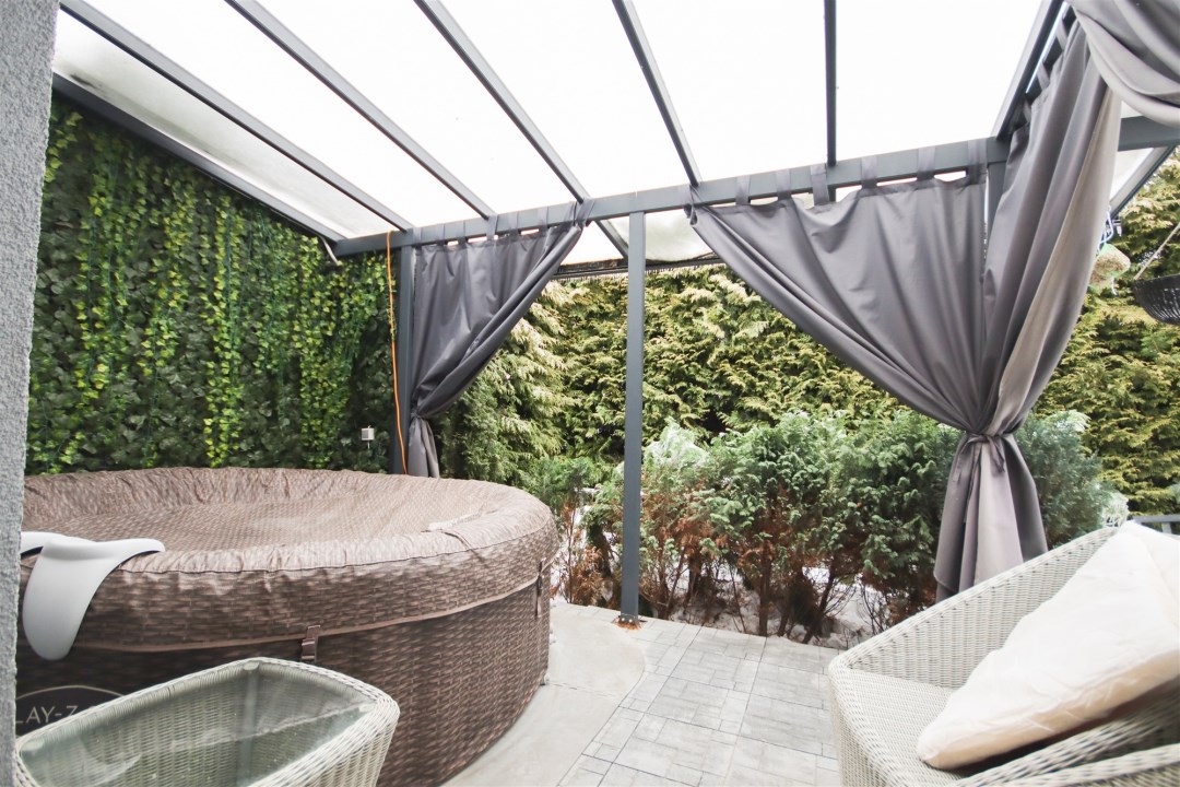 Na tarasie znajduje się antresola, stanowiąca dodatkową przestrzeń wypoczynkową.