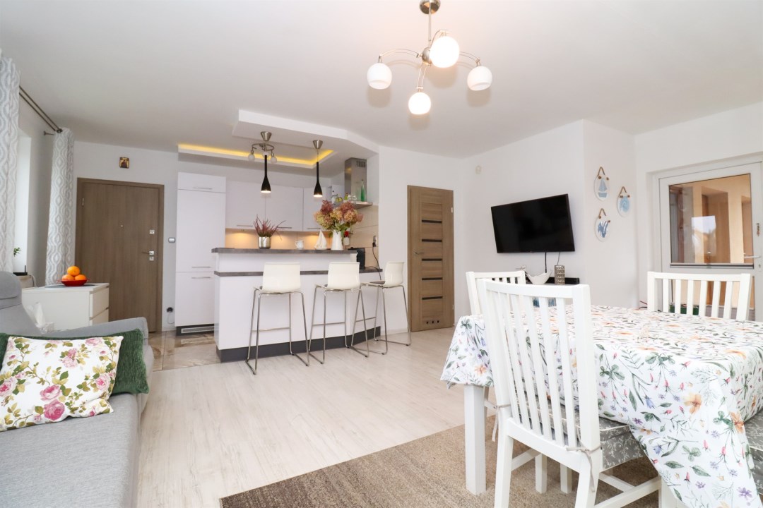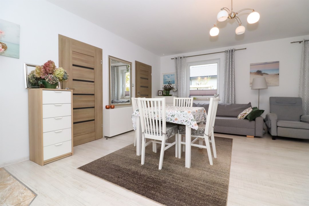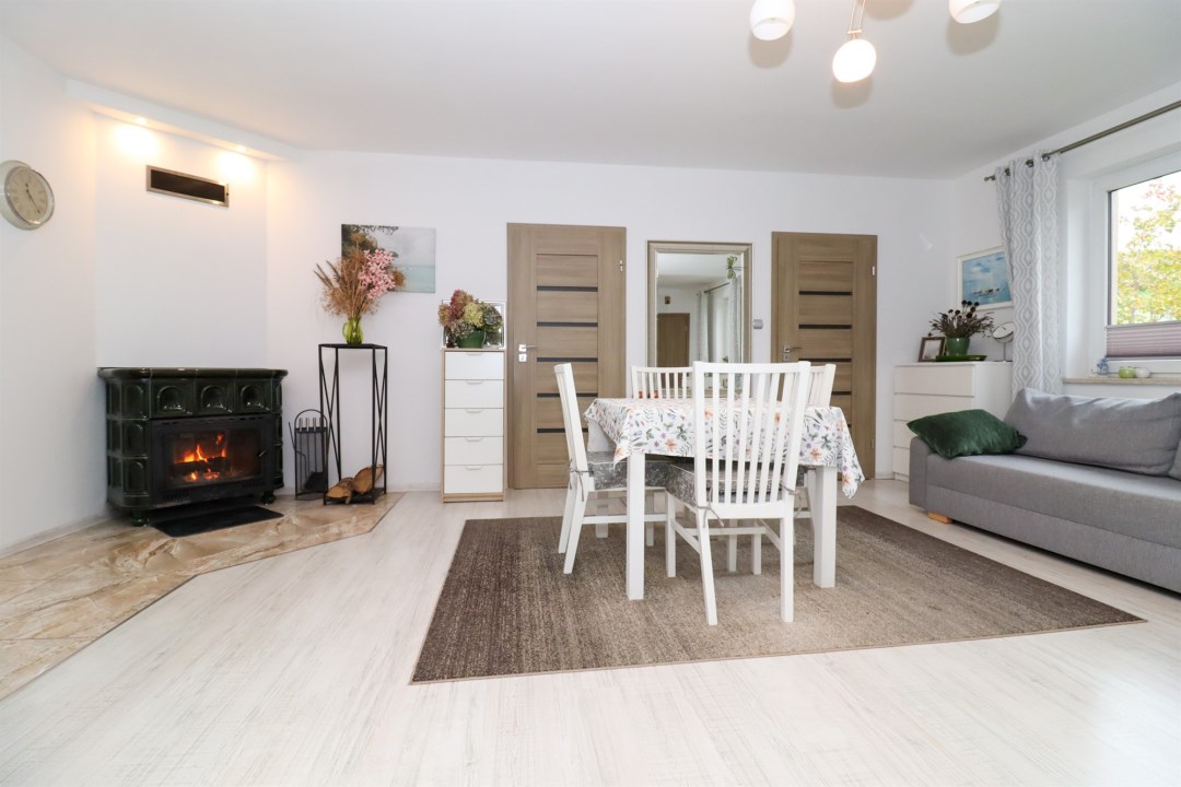 W salonie znajdują się wygodne meble wypoczynkowe oraz funkcjonalna strefa jadalniana. Klimatu dodaje stylowy kominek opalany drewnem, który pełni zarówno funkcję dekoracyjną, jak i praktyczną – świetnie dogrzewa wnętrze w chłodniejsze dni. Duże okno zapewnia bardzo dobre doświetlenie pomieszczenia.