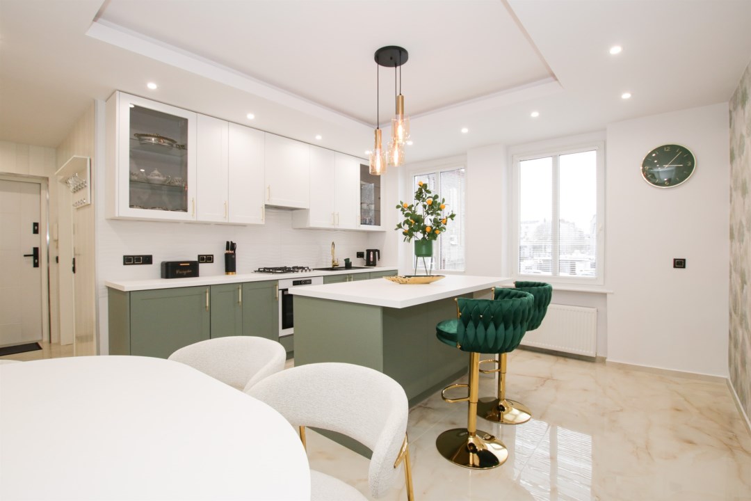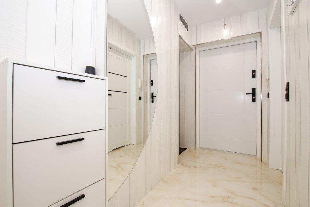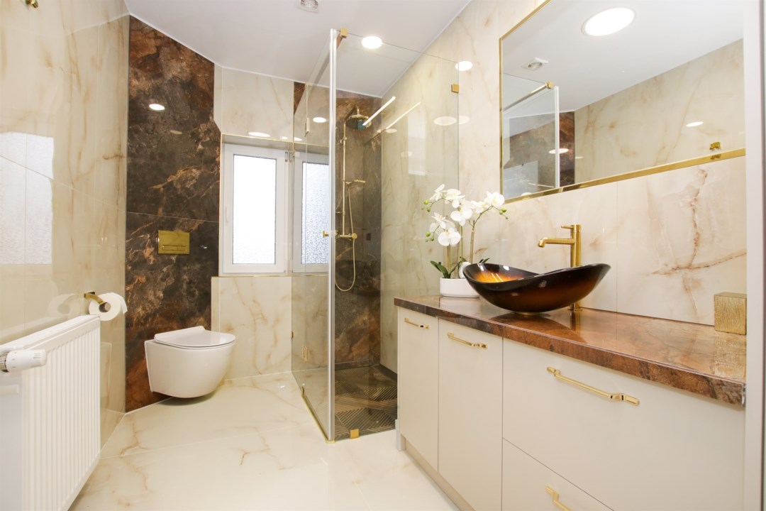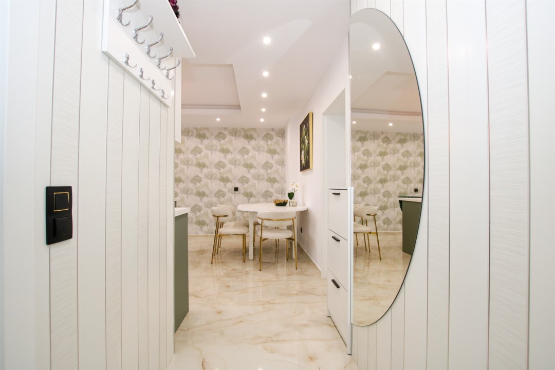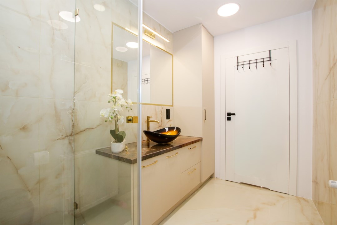 Wnętrze utrzymane jest w eleganckiej, stonowanej kolorystyce, z wykorzystaniem modnych kaszmirowych tonów, luster oraz nowoczesnego oświetlenia, co tworzy wyjątkowy klimat i podkreśla prestiż nieruchomości.