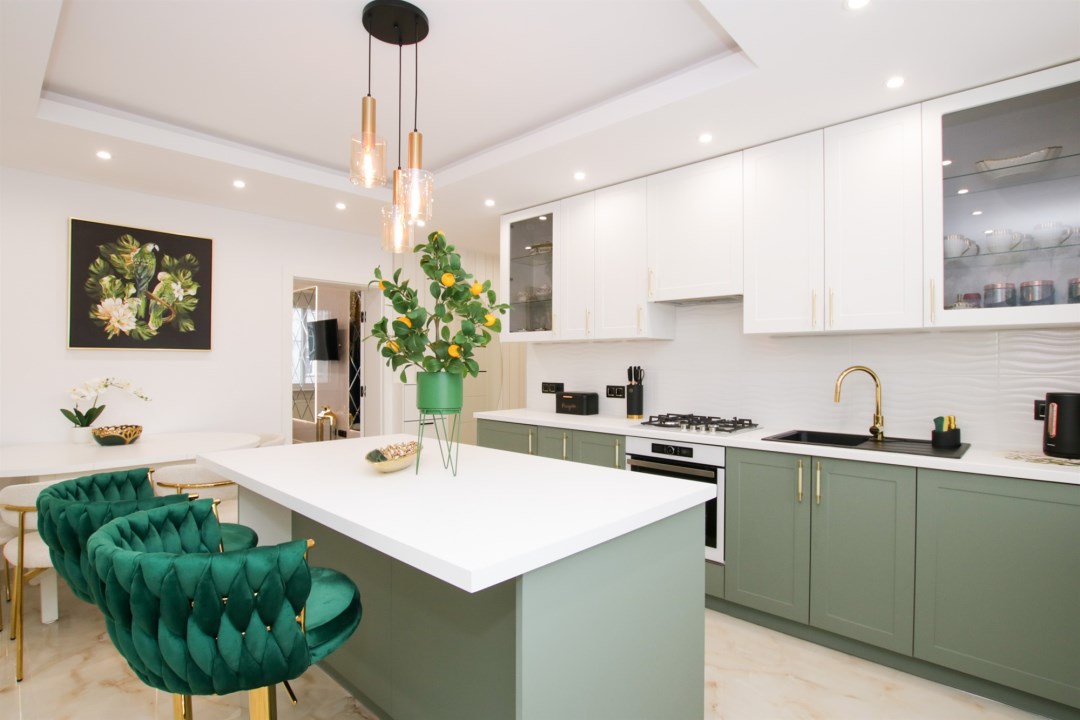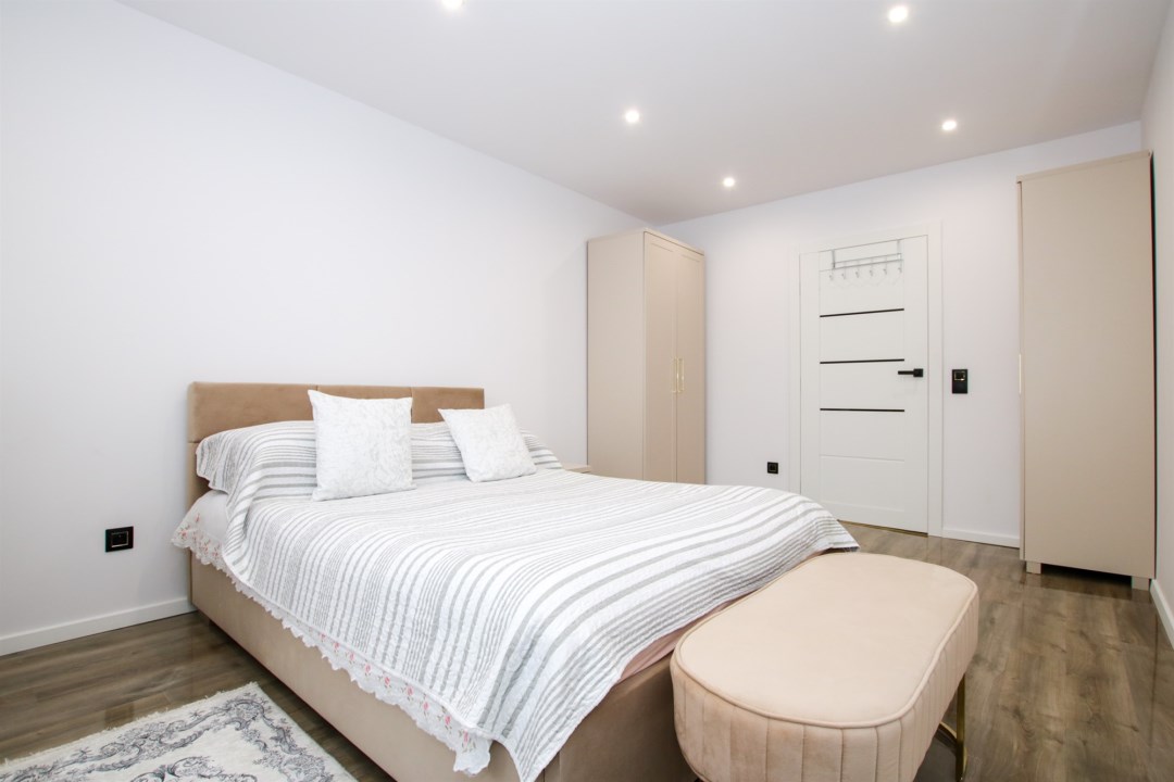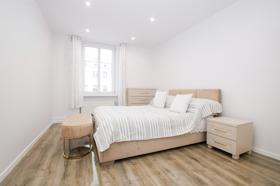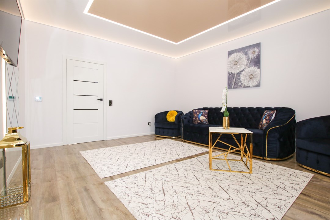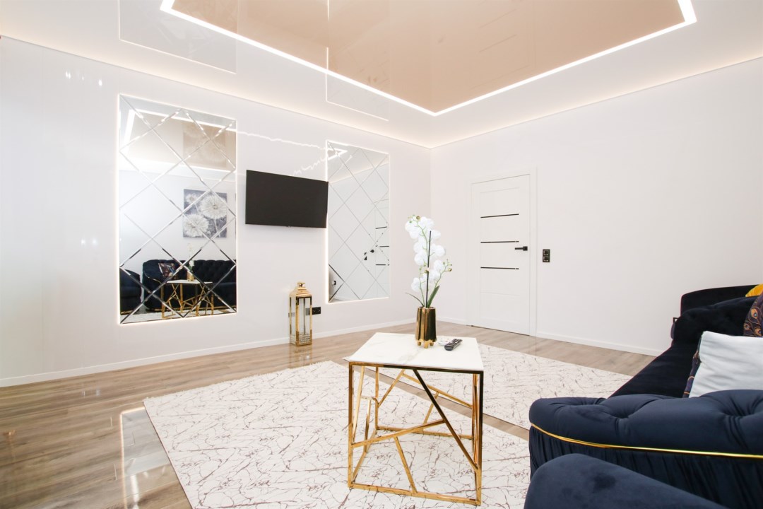 Wnętrze utrzymane jest w eleganckiej, stonowanej kolorystyce, z wykorzystaniem modnych kaszmirowych tonów, luster oraz nowoczesnego oświetlenia, co tworzy wyjątkowy klimat i podkreśla prestiż nieruchomości.