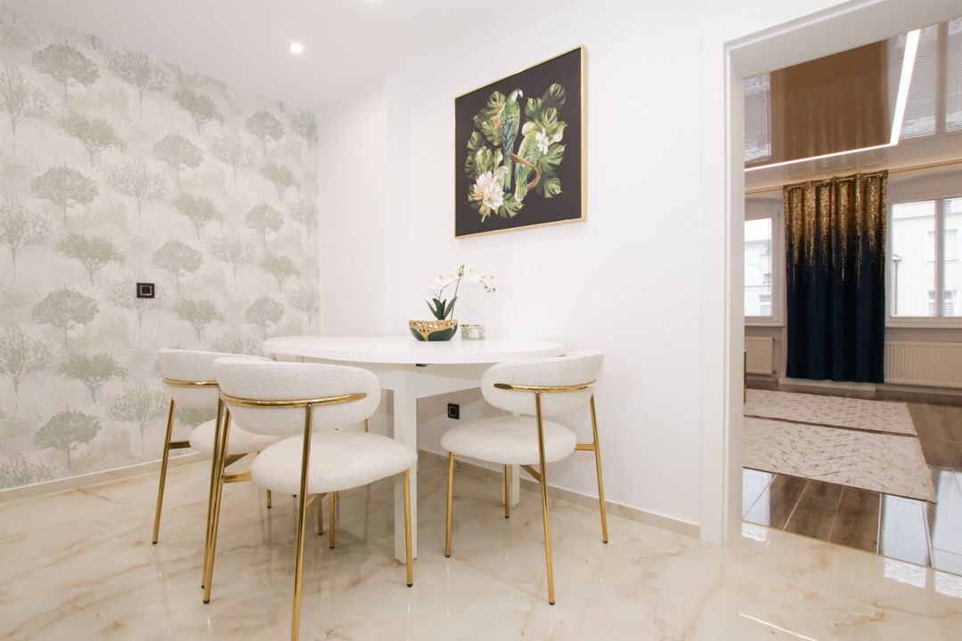 Mieszkanie przeszło kompleksowy remont generalny z wykorzystaniem wysokiej klasy materiałów oraz nowoczesnych rozwiązań. Wnętrze zostało zaprojektowane przez projektanta, dzięki czemu tworzy spójną, elegancką i ponadczasową przestrzeń w standardzie premium.