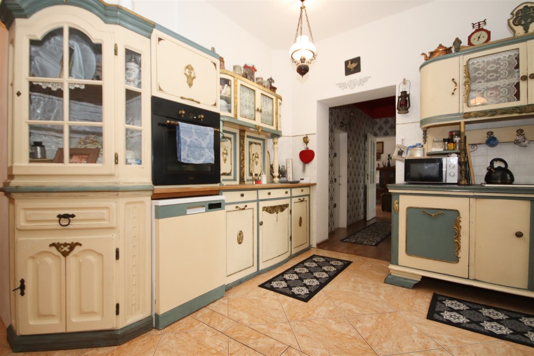 - Kuchnia – w zabudowie, w formie stylowego kredensu, z pełnym wyposażeniem AGD (piekarnik, zmywarka, lodówka).