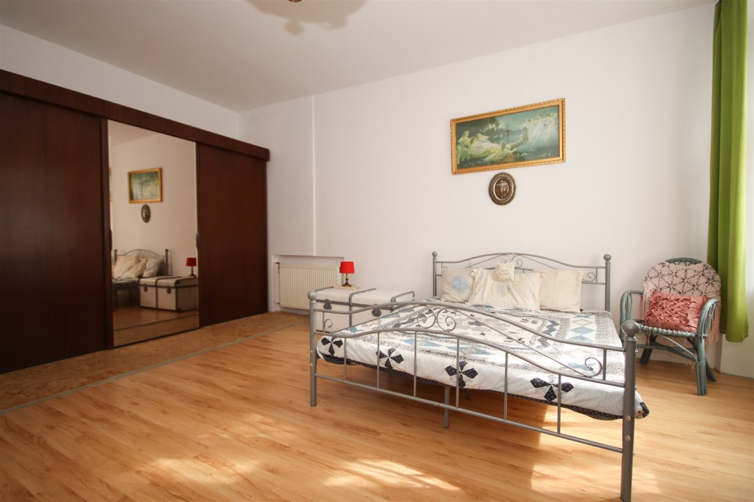 - Sypialnia główna – jasna i duża, z łóżkiem i pojemną szafą w zabudowie z lustrami.